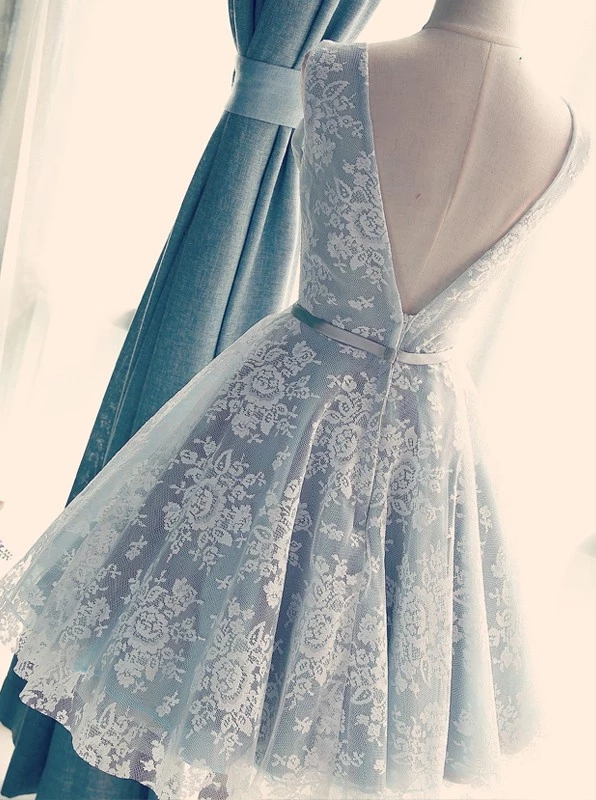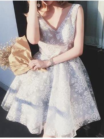 Elegant A-Line Lace Homecoming Dresses with Gray Lining Short Prom Dresses Cheap V-Neck Teen Party Dresses