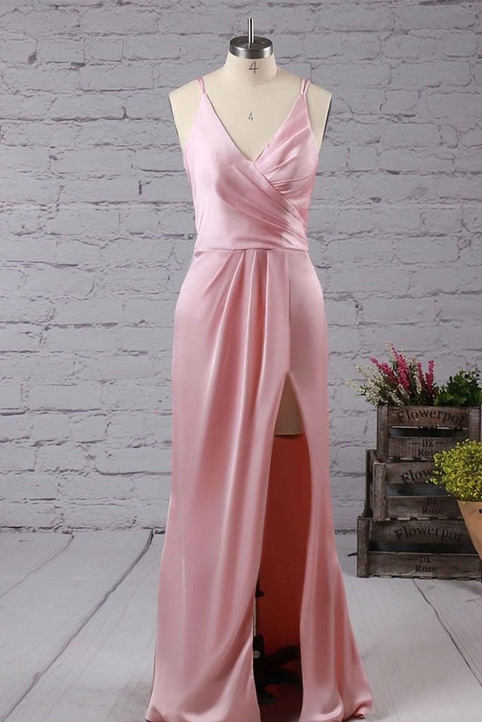 Pink Satin V-Neckline Long Evening Dress with Front Split, Homecoming Dresses, Graduation Dresses, Cocktail Dresses, Pink Bridesmaid Dresses