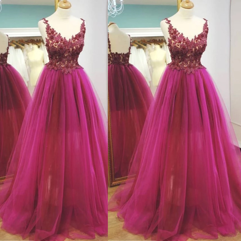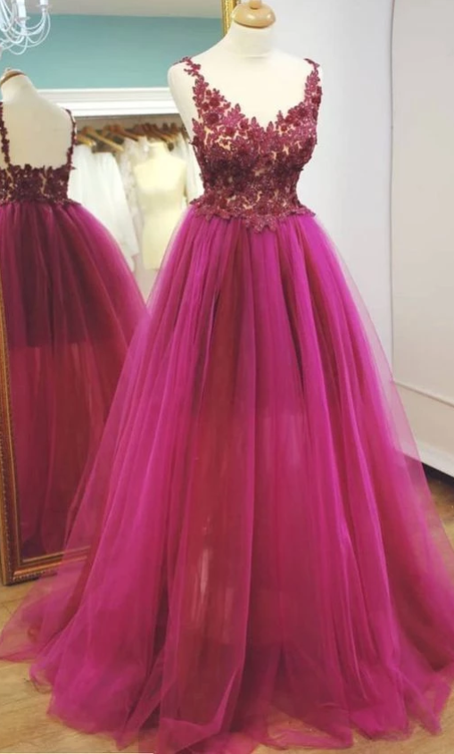 Long Tulle Prom Dresses,Formal Dress,Prom Dress, Lace Appliques Evening Dresses