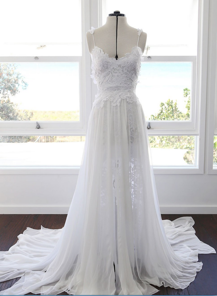 Boho Wedding Dresses, A-line Spaghetti Strap White Lace Chiffon Summer Beach Wedding Bridal Dresses