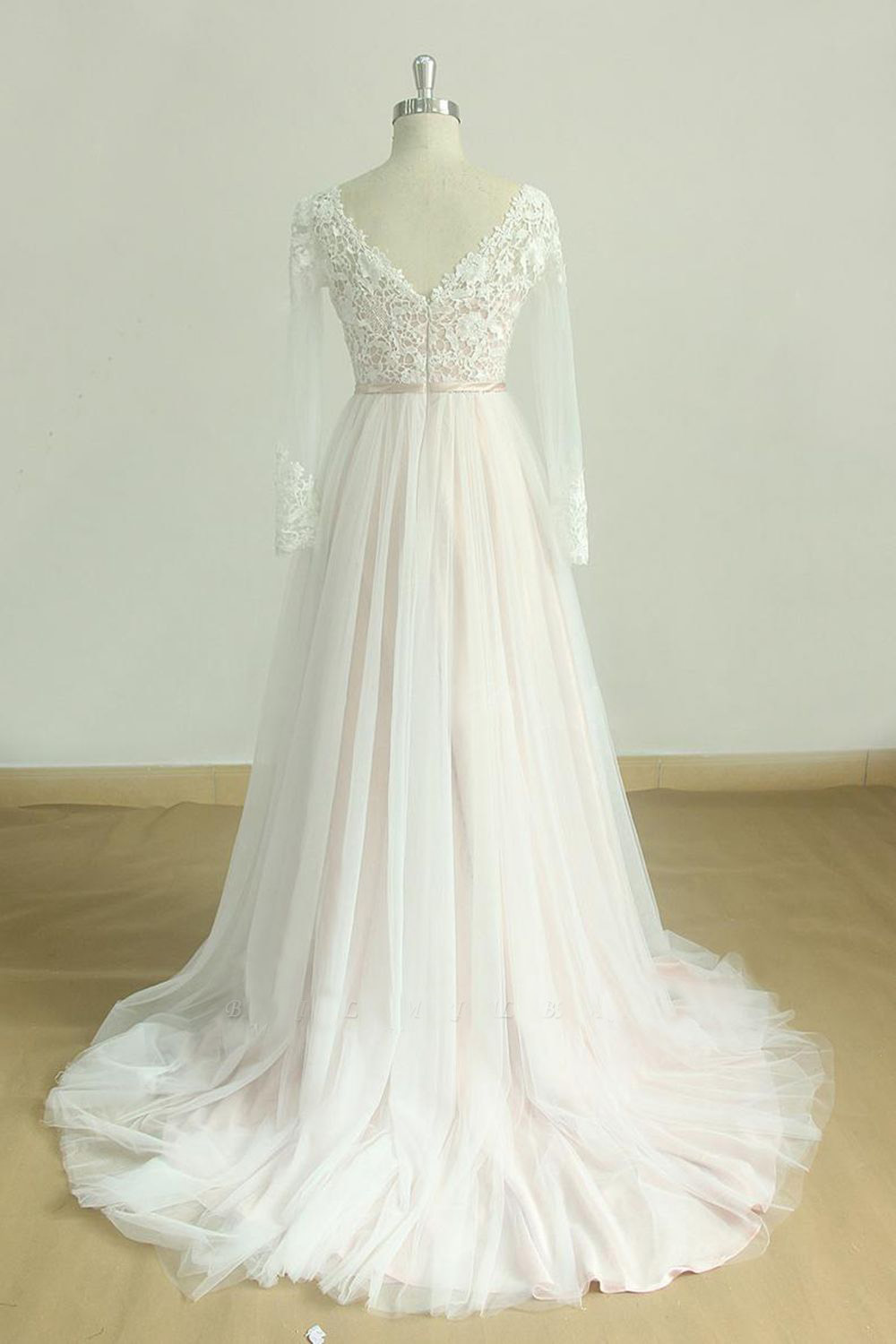 White Tulle Blush Lining Long Sleeve Wedding Dresses with Appliques A-Line Bridal Gowns