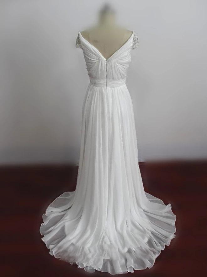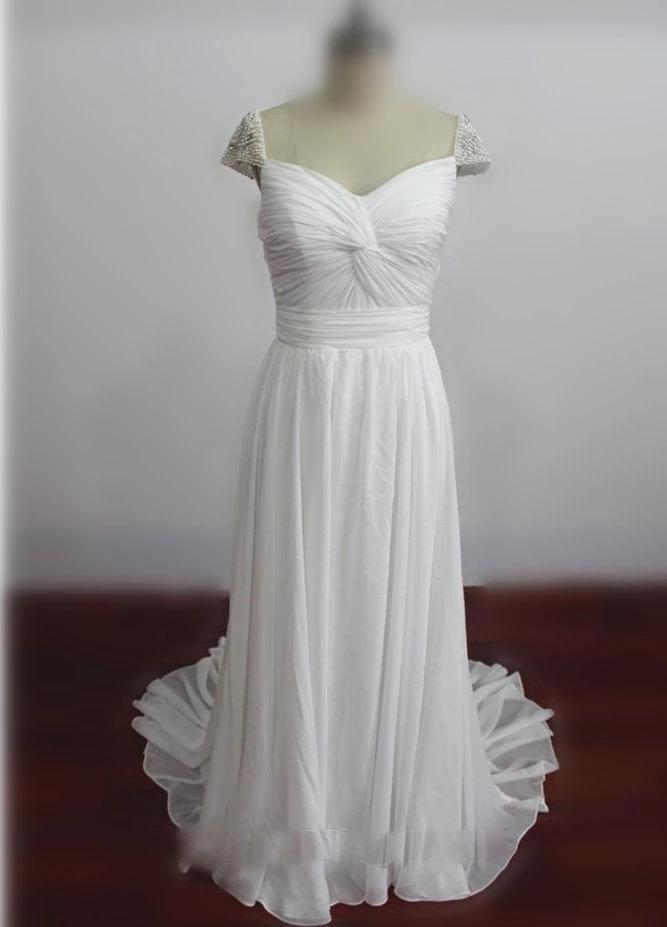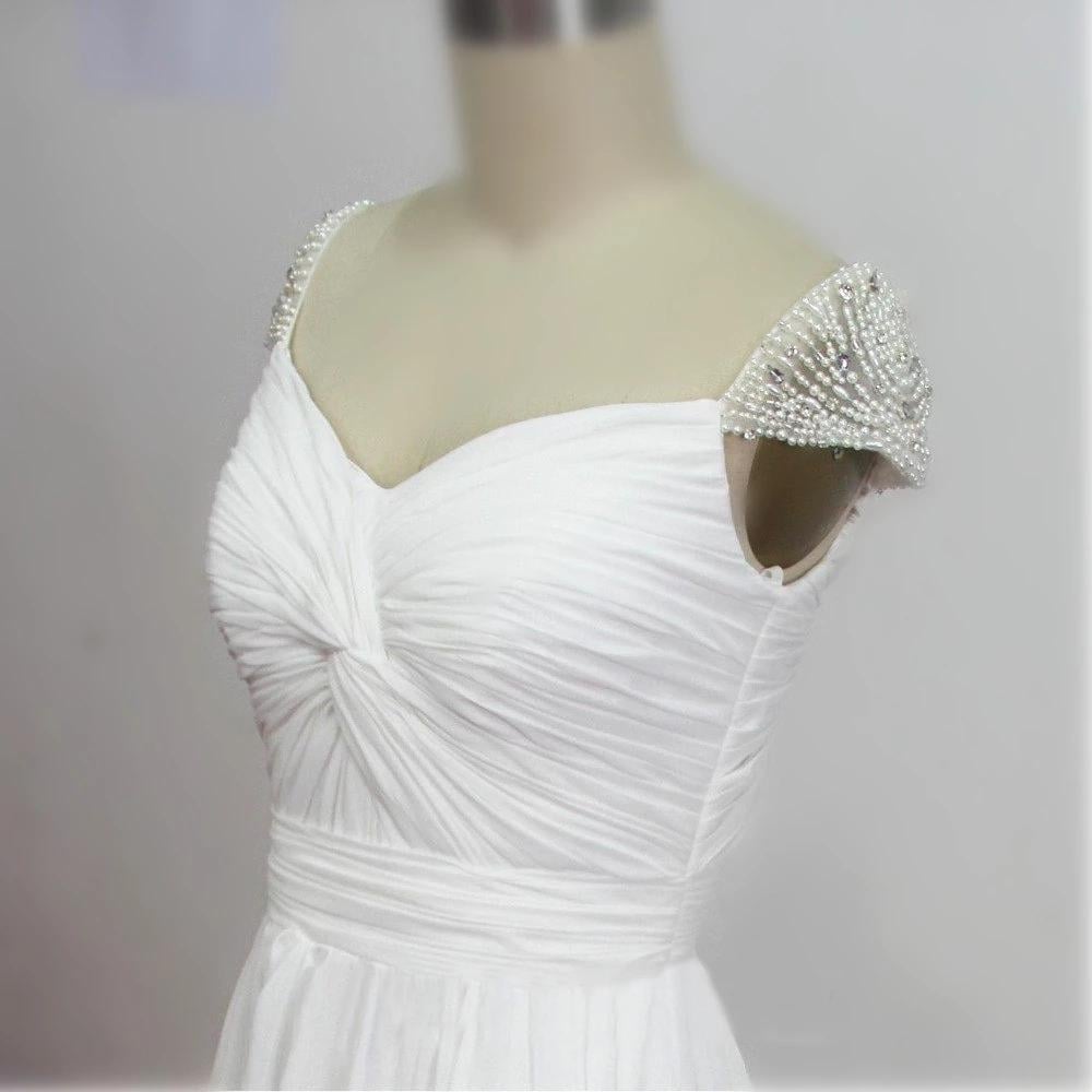 Romantic White Chiffon A-line Bridal Dresses with Beaded Short Sleeve