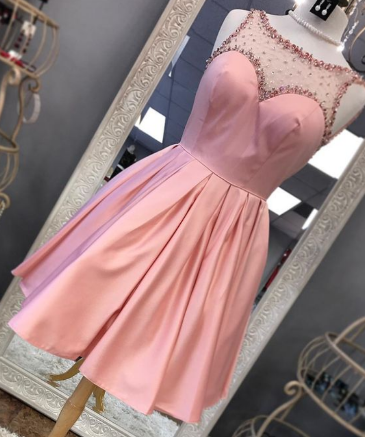 Princess A-line Pink Short Beads Homecoming Dress, Short Prom Dress