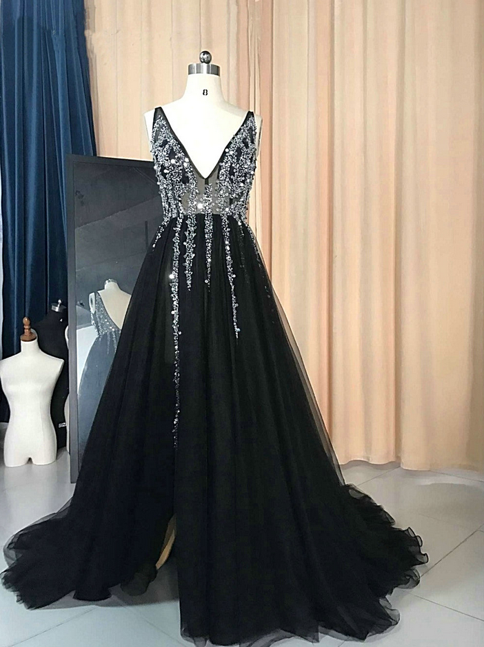 Sexy V Neckline Beaded Black Evening Dresses,Sweep Train Formal Dresses Black,Shinning Evening Party Dresses