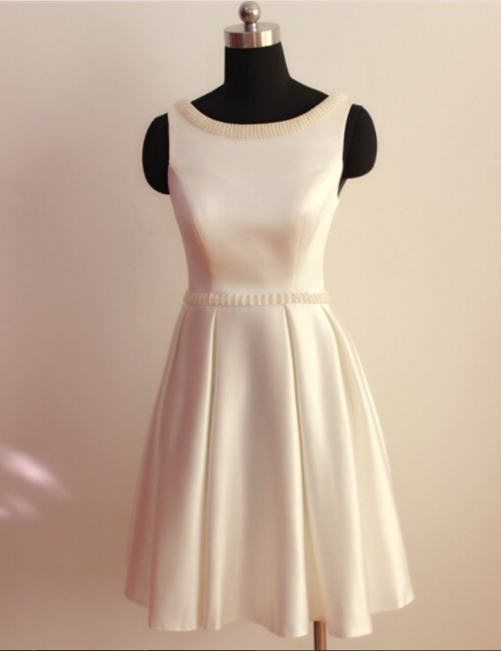 Pearl Embellished Satin Crew Neck Sleeveless Knee Length Wedding Guest Dress, Homecoming Dresses, Short Prom Dress