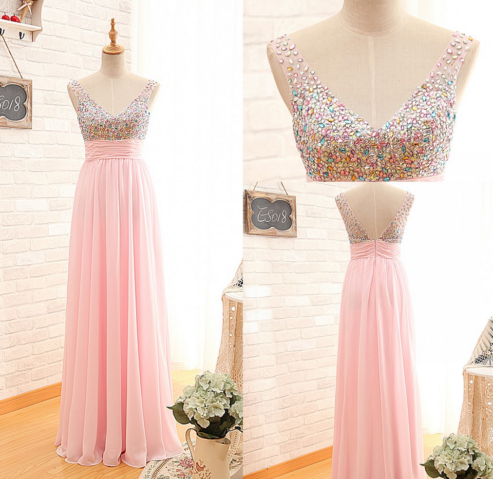 V-neckline Beaded Pink Prom Dress,Long V-back Blush Pink Graduation Dress,Beaded Light Pink Formal Party Dress