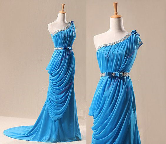 Blue Bridesmaid Dresses, One Shoulder Blue Long Prom Gown with Belt, Blue Prom Gowns,Prom Dresses