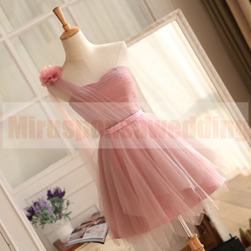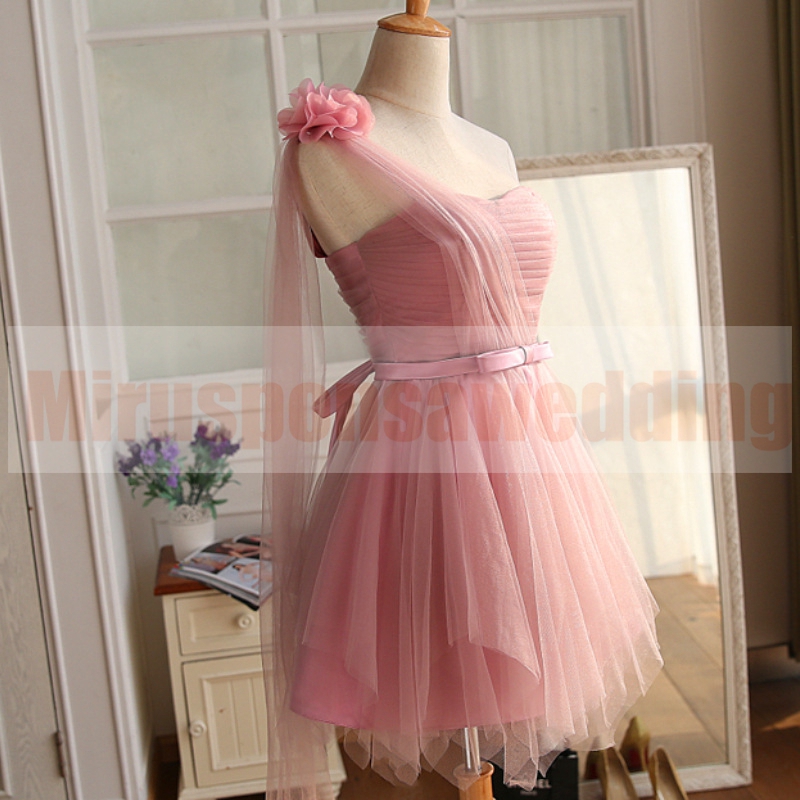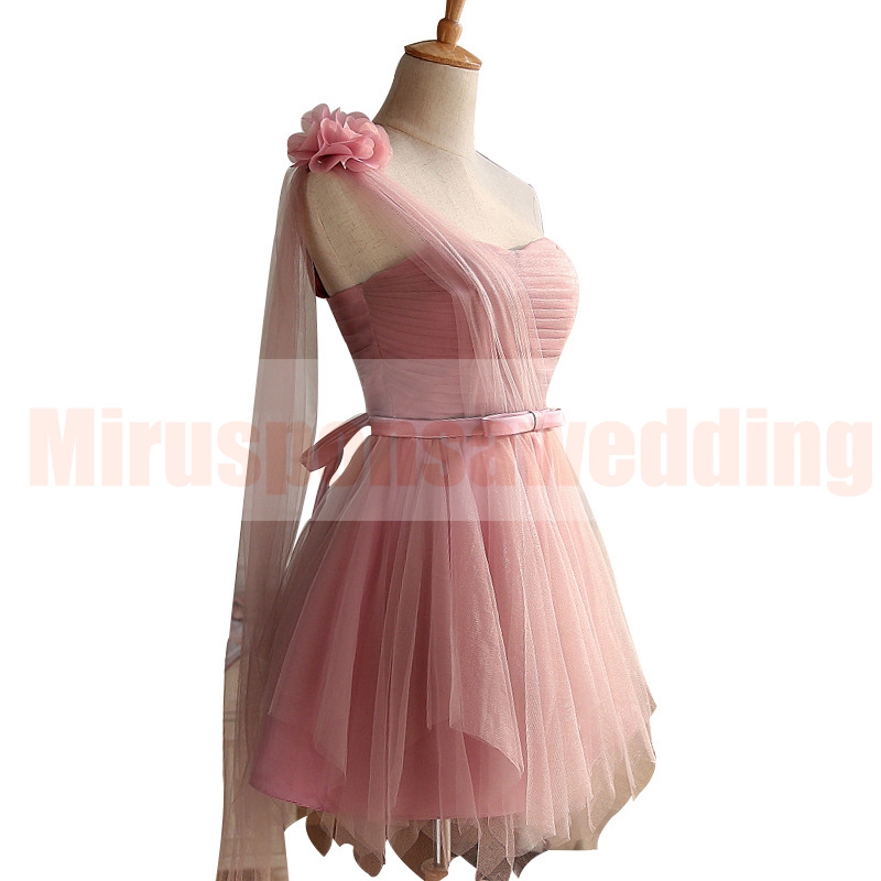 Sweet One Shoulder Pink Prom Dresses Illusion Bodice Ruched Tulle Short Evening Gowns Sleeveless Formal Evening Dresses with 3D Flowers