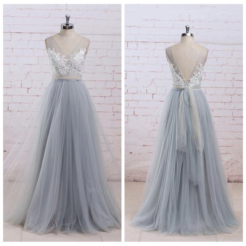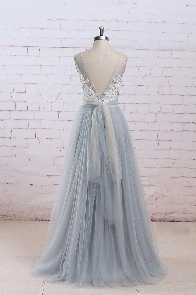 Graceful Tulle Grey Lace Homecoming Dresses A Line Appliques Fabulous Prom Dresses Plunging Back Sash Bodice Long Evening Dresses