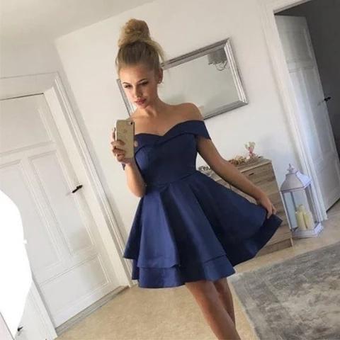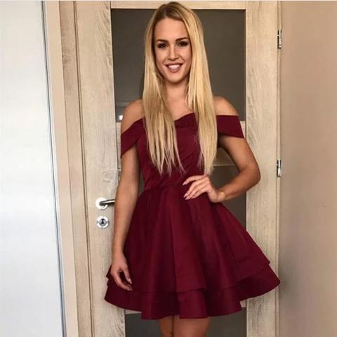 Chic Off-shoulder Satin Cheap Homecoming Dresses with Sleeves Burgundy Prom Dresses Tiered Short Formal Dresses