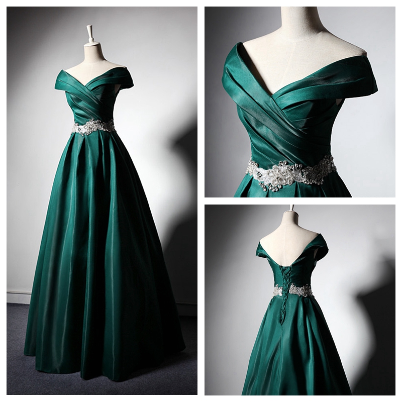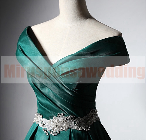 Chic Bateau Neck Green Prom Dresses Beaded Decoration Formal Party Dresses Short Capped Sleeve Satin Evening Gowns with Lace Up