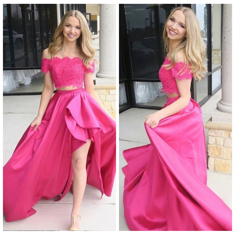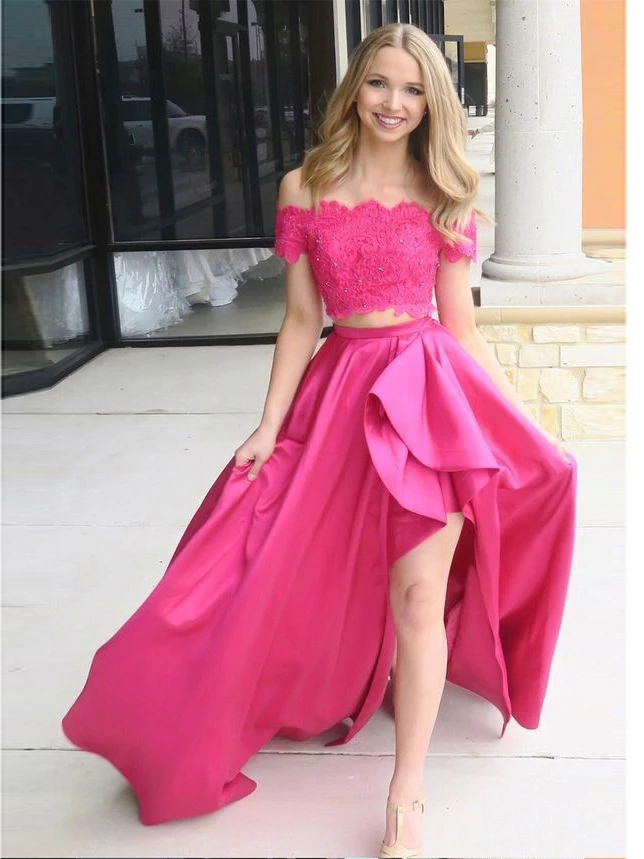 Chic Off-shoulder Two Piece Homecoming Dress A-Line Hot Pink High Low Prom Dresses Lace Satin Girls Party Dresses