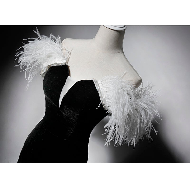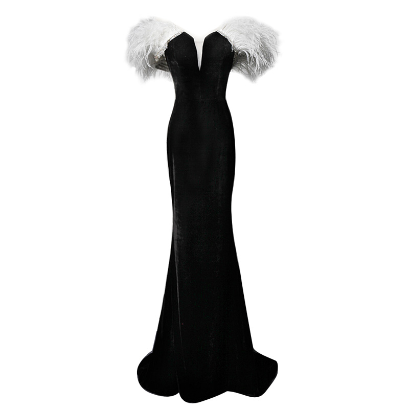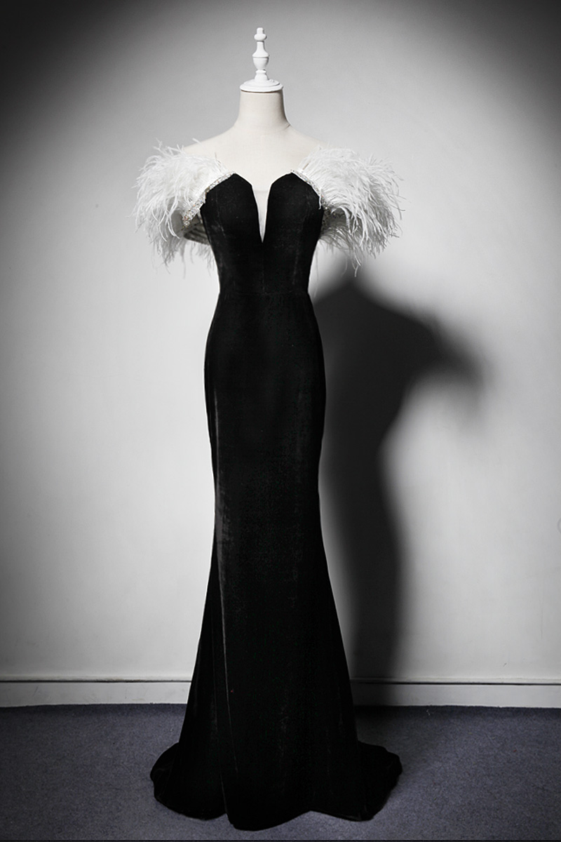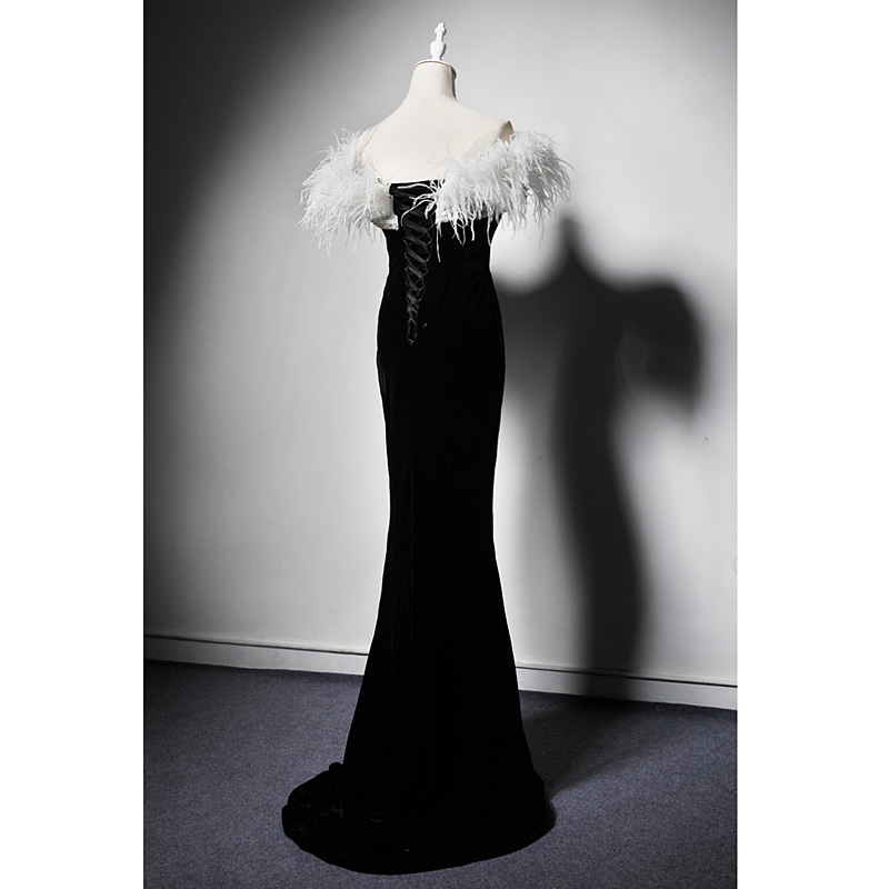 Feather Decoration Formal Black Prom Dresses Spring Long Strapless Velvet Evening Dresses Sleeveless Mermaid Evening Gowns with Sweep Train