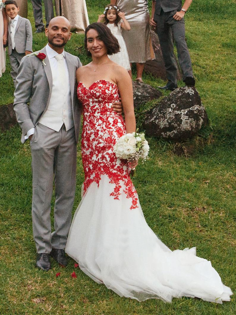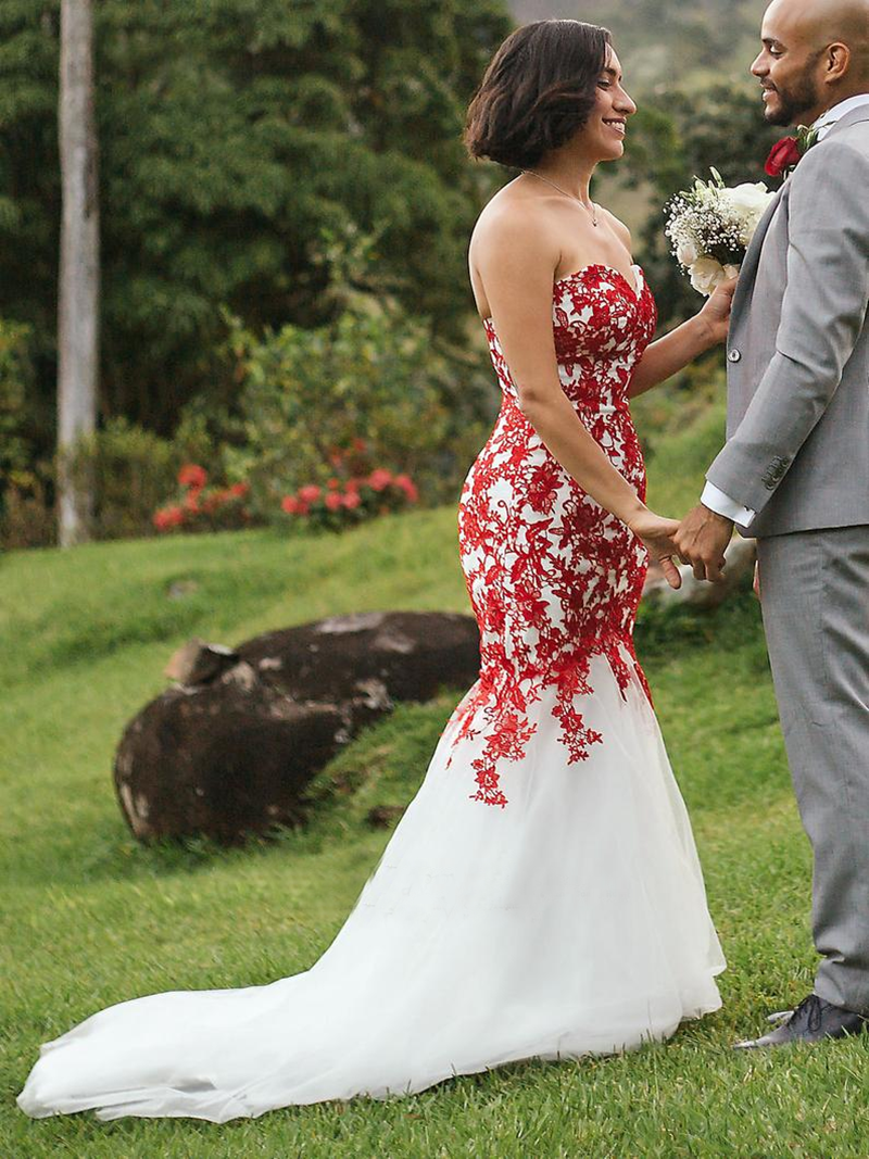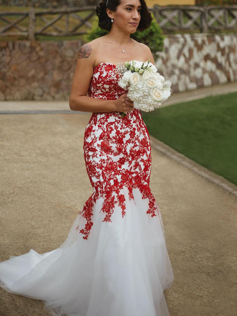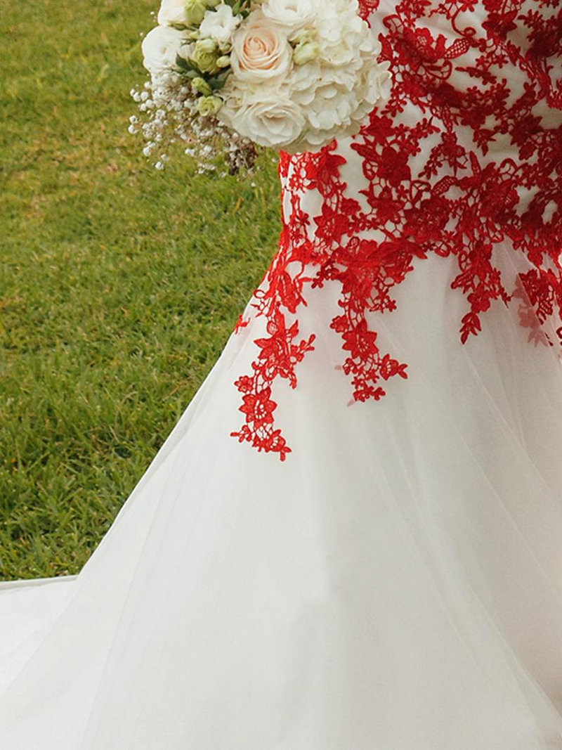 Charming Sweetheart Tulle Red and White Wedding Dresses Appliques with Court Train Mermaid Wedding Dress Lace Up Back Bridal Gowns Online