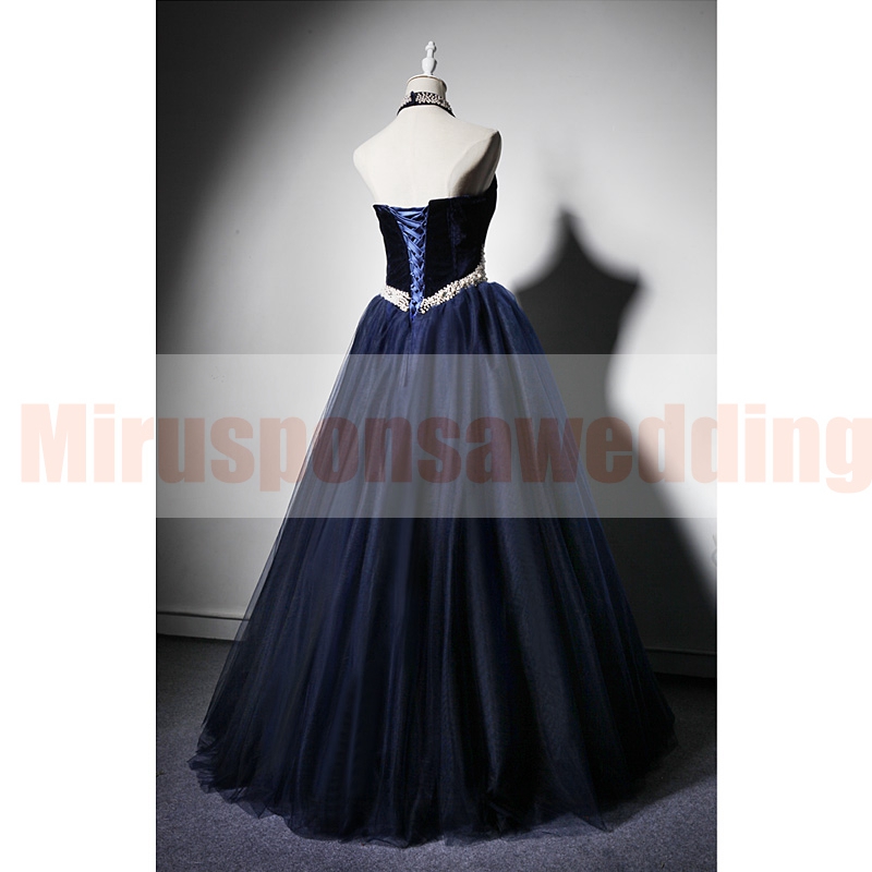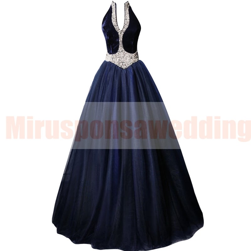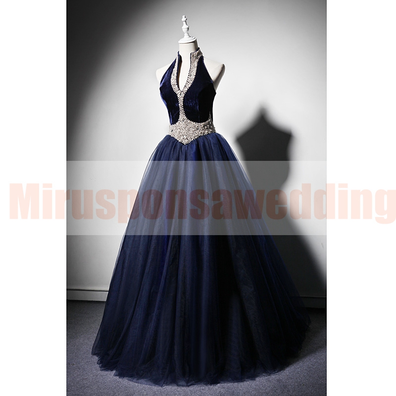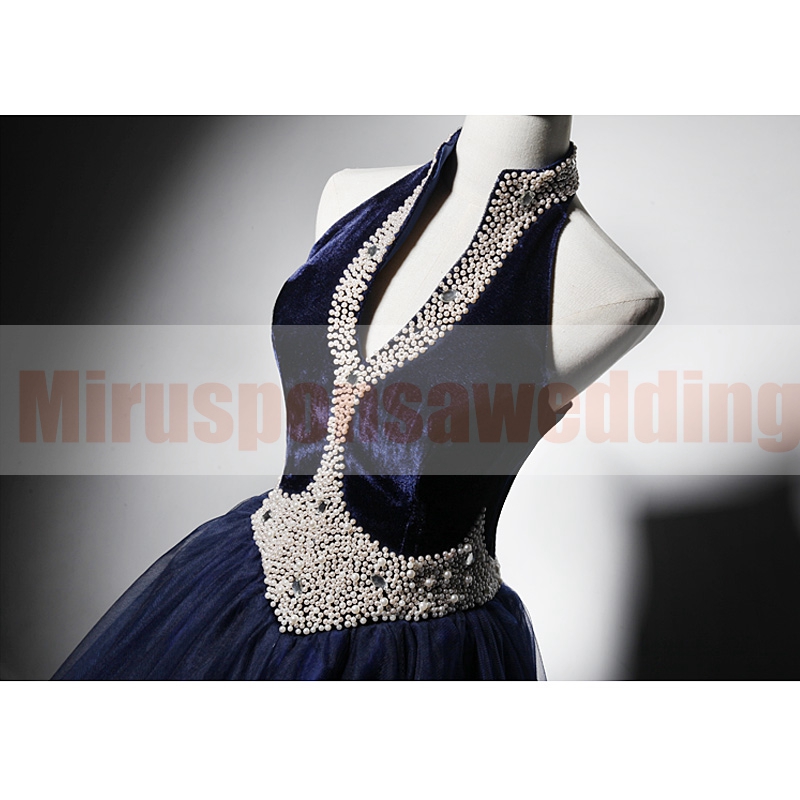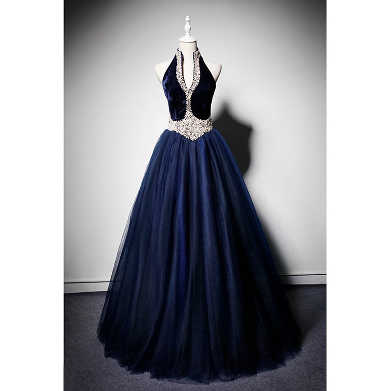 Unique Design Halter Neck Long Prom Dresses Sleeveless Pearls Beading Navy Blue Evening Gowns Ruched Tulle A Line Evening Dresses with Lace Up