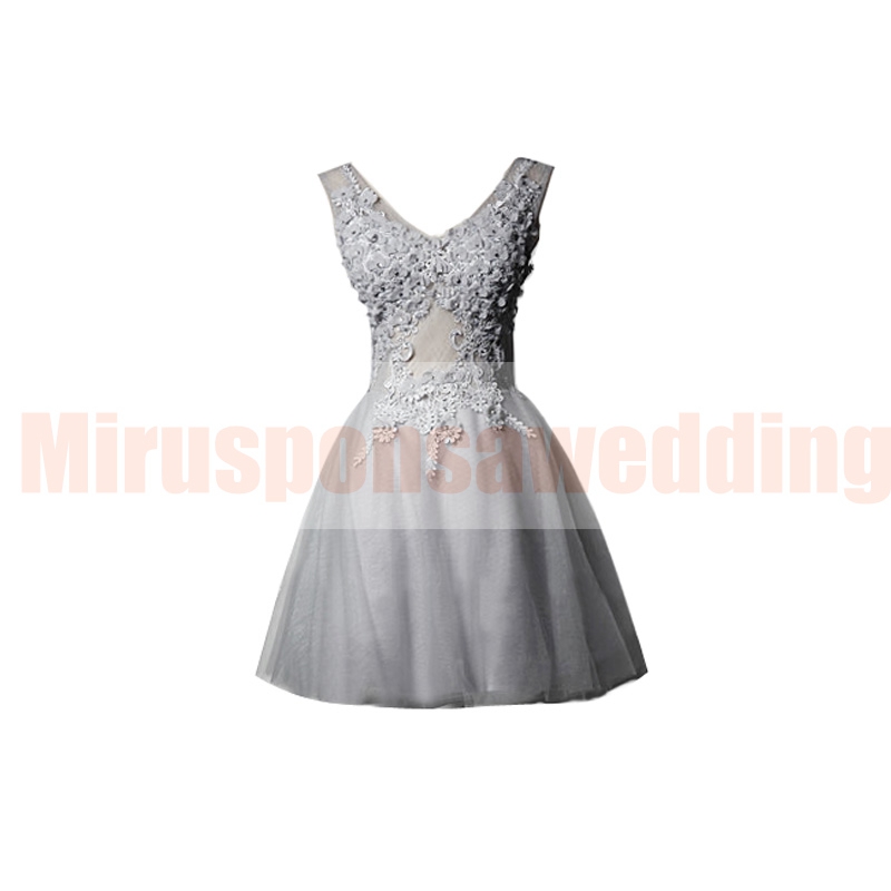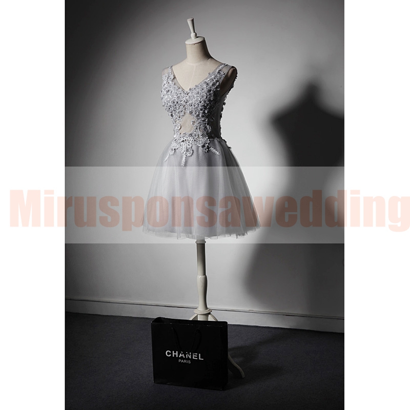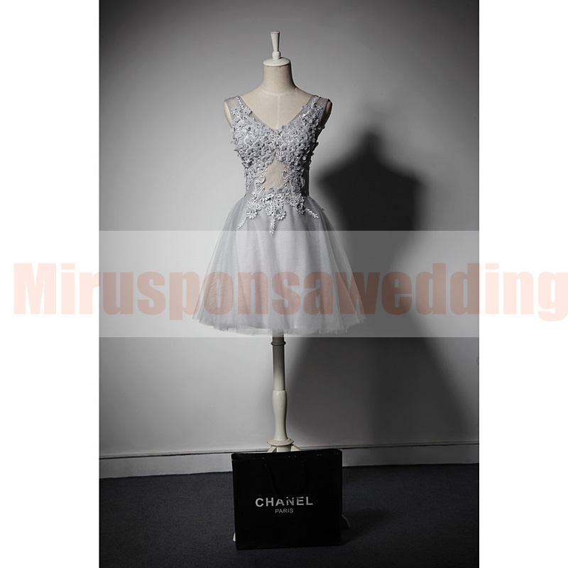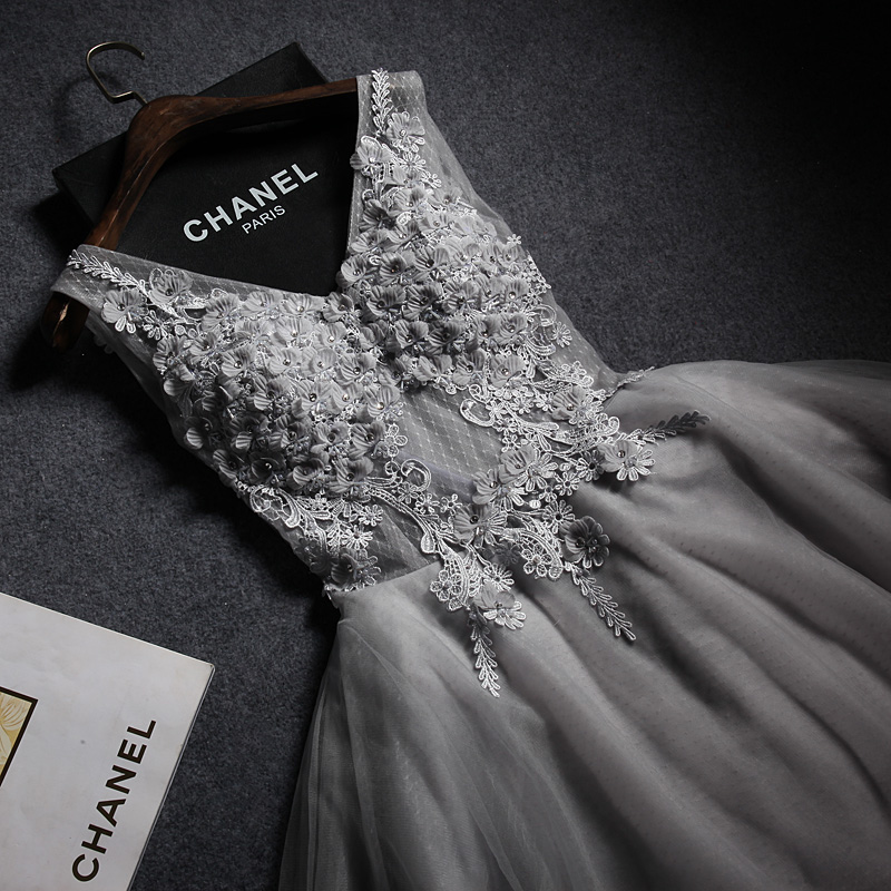 Charming V-Neck Ball Gown Prom Dresses 3D Floral Appliques and Pearls Beading Light Gray Cocktail Dresses Lace Up Short Evening Gowns