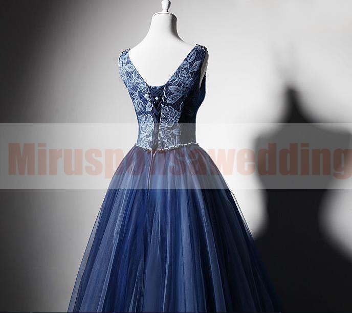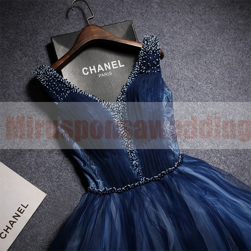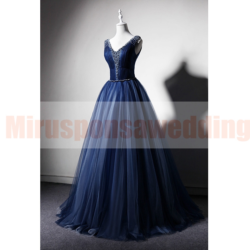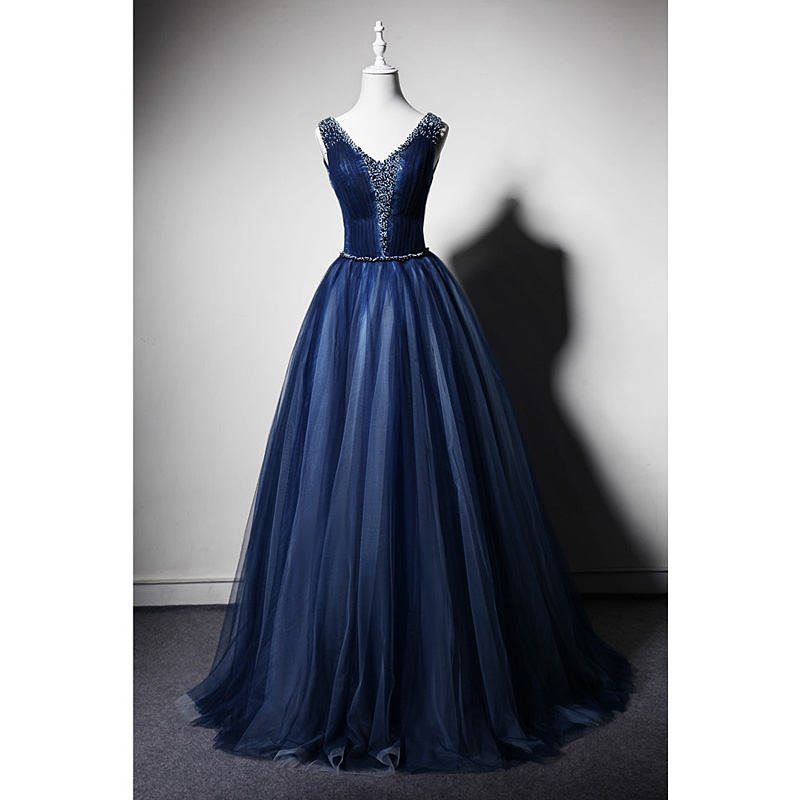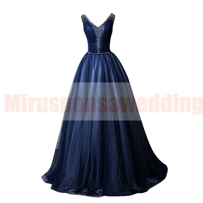 Charming V-Neck Navy Blue Evening Gowns Major Beading A Line Boho Prom Dresses Spring Sleeveless Long Evening Dresses with Sweep Train