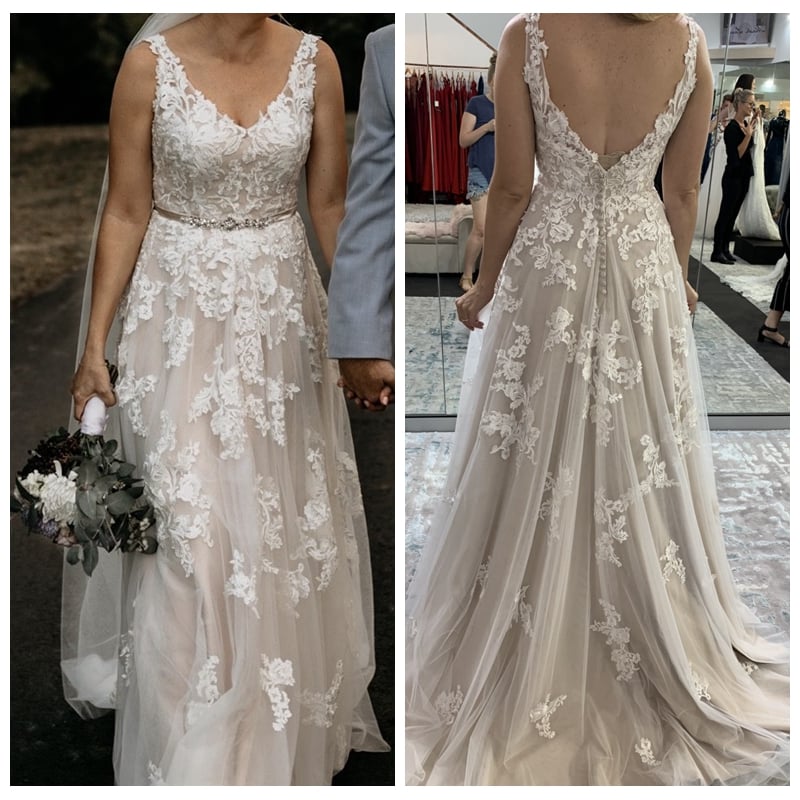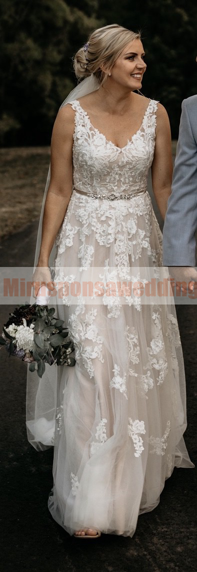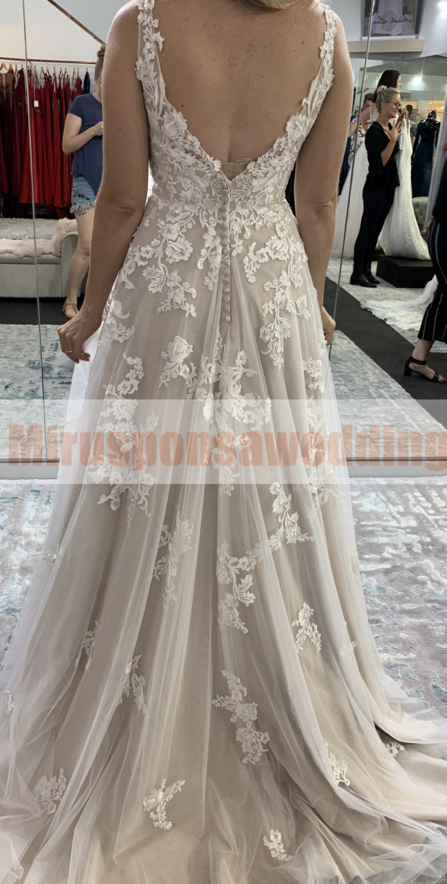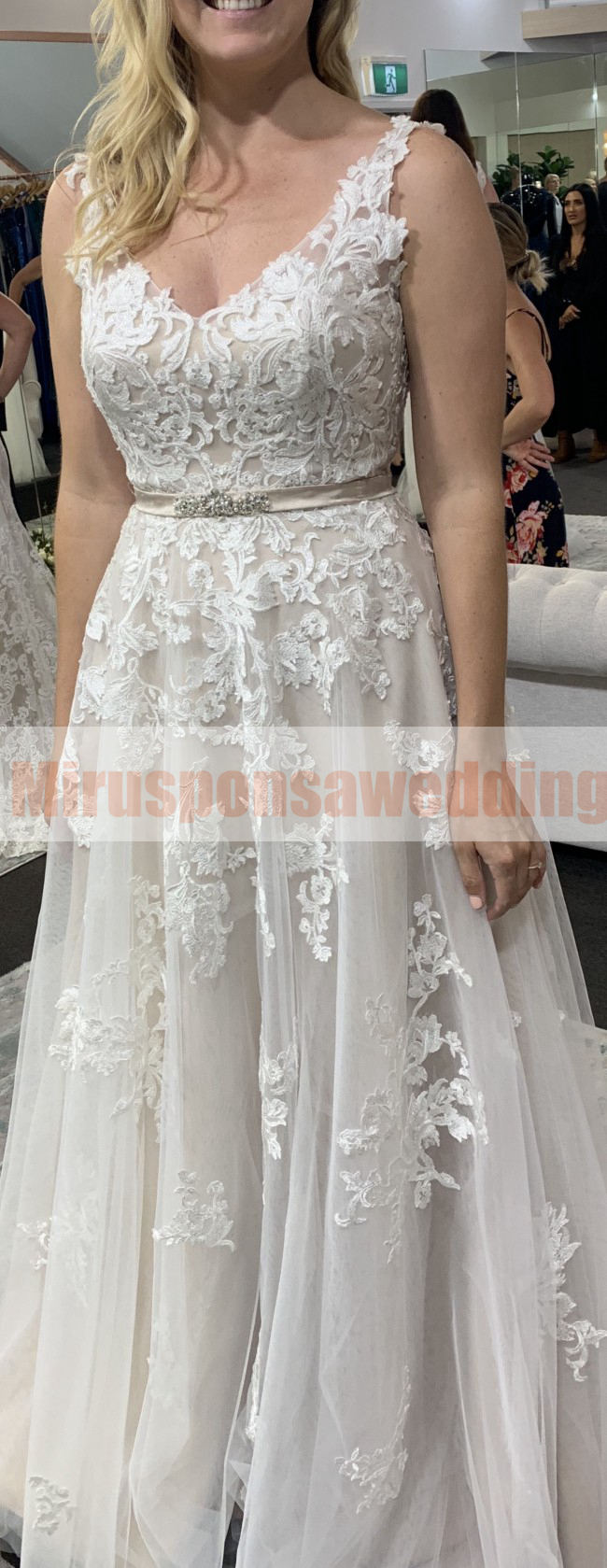 Elegant A-Line Beautiful Wedding Dresses with Champagne Lining Lace Appliques Simple Wedding Dresses Plunging Back Beaded Sash Bridal Gowns