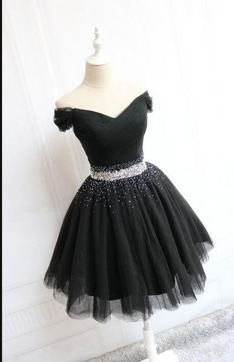 Elegant Off the Shouldre A Line Prom Dress Ruched Tulle Black Short Homecoming Dresses Beaded Decoration Formal Party Dresses