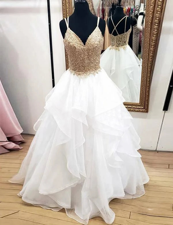 Charming Spaghetti Straps White and Gold Prom Dresses A-Line Lace Appliques Junior Formal Dresses Ruffled Skirt Cheap Evening Dresses