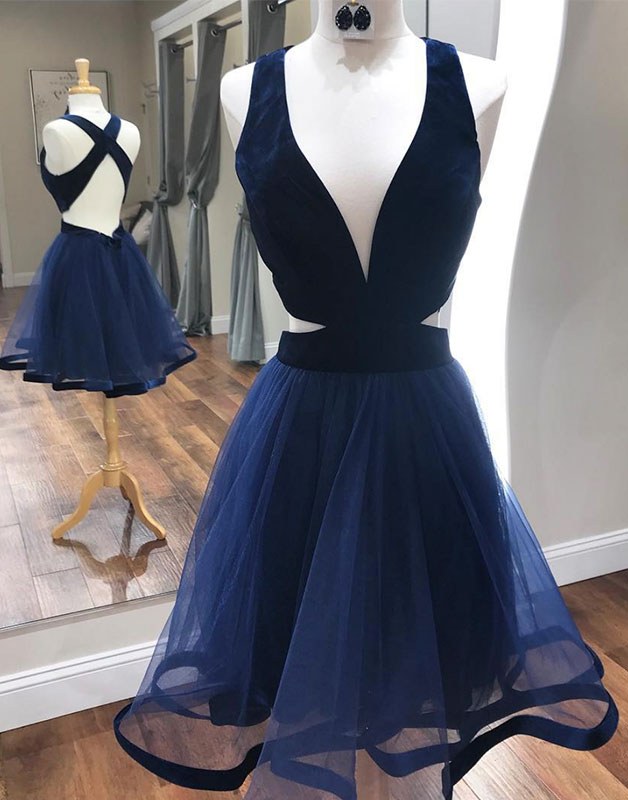 Deep V-Neck Sexy Cocktail Dresses with Criss Cross Back A Line Navy Blue Short Prom Dress Sleeveless Boho Evening Gowns for Formal Party