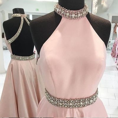 Alluring Halter Satin Long Dresses for Homecoming A-Line Crystals Beading Pink Prom Dresses Backless Party Dresses for Teens