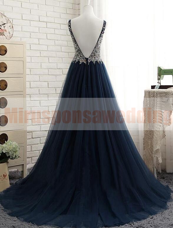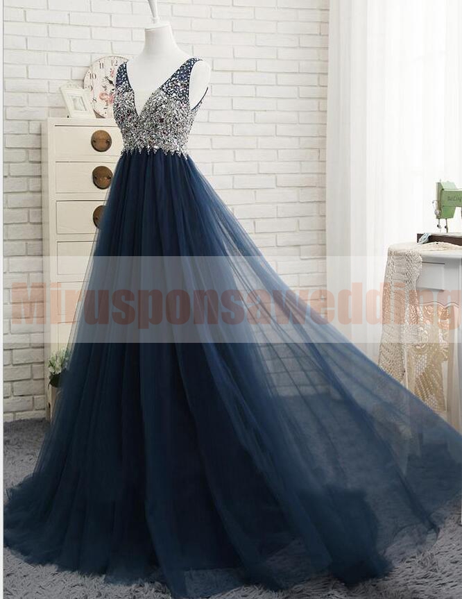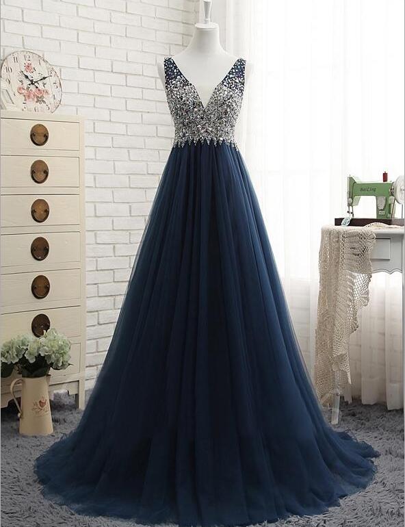 Gorgeous Beaded Crystal Luxury Evening Gowns V- Neck Navy Blue Ruched Tulle Long Prom Dress Sexy Backless A Line Women Party Dresses