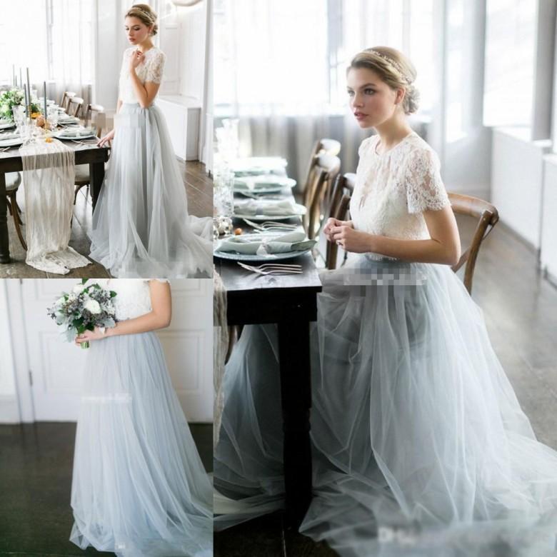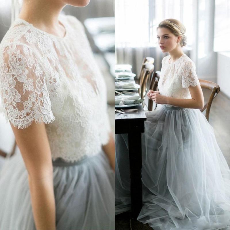 Romantic Two Piece Wedding Dress A-Line Lace Appliques Short Sleeve Designer Wedding Gowns with Court Train Boho Wedding Dress
