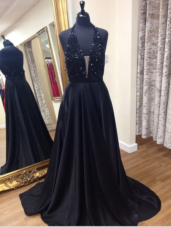 Sexy Deep V-Neck Halter Neck Cocktail Party Dresses Sequins and Beaded A Line Backless Prom Dresses Sleeveless Black Evening Gowns with Sweep Train
