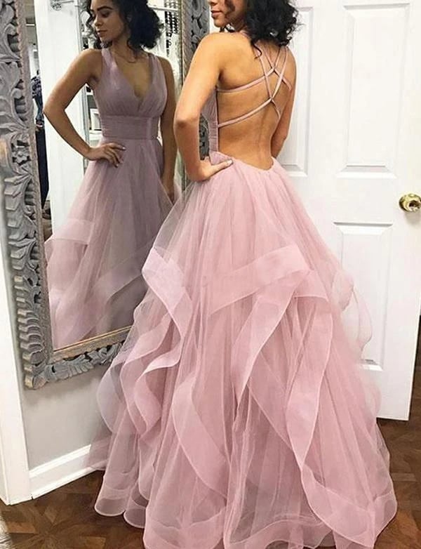 Sexy Pink Long Prom Dresses V Neck Backless Evening Dresses for Women with Ruffled Skirt Bridal Party Dresses