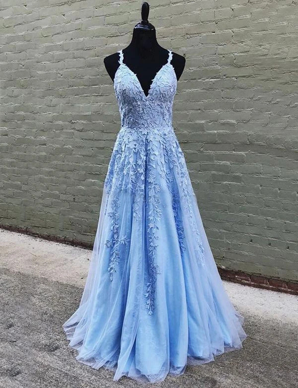 Beautiful A Line Spaghetti Straps Blue Prom Dresses with Lace Appliques Holiday Party Dresses