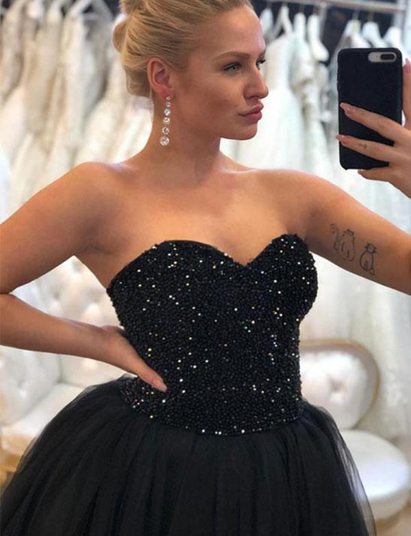 Classic A line Sweetheart Black Prom Dresses with Crystals Pearls Beading Black Formal Dress Sweep Train Wedding Party Dresses