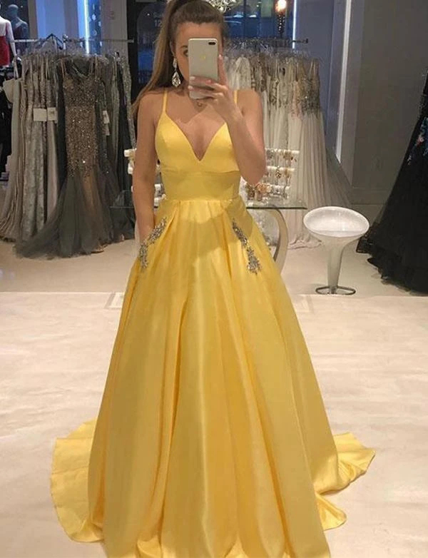 Simple A Line Spaghetti Straps Yellow Prom Dresses with Pockets Crystals Beading Junior Party Dresses Sweep Train Simple Homecoming Dresses