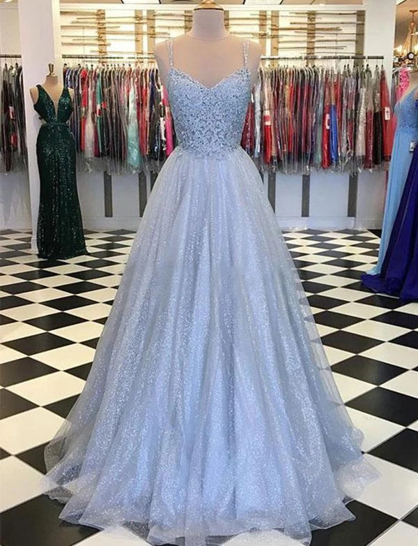 Sparkly Light Blue Prom Dresses Spaghetti Straps Lace Appliques Evening Party Dresses Sweep Train Engagement Dresses