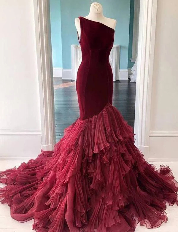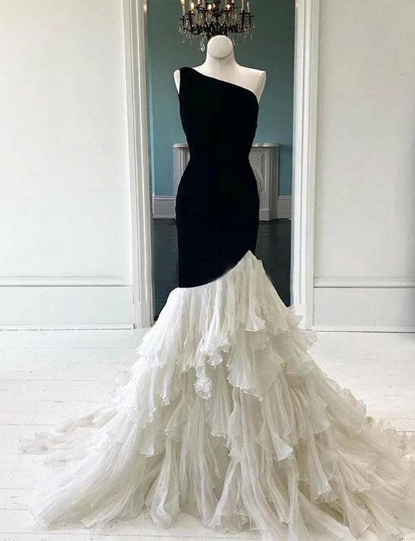 Unique Burgundy Mermaid Prom Dresses Trumpet One Shoulder Black and White Evening Dresses with Ruffled Skirt Wedding Party Dresses