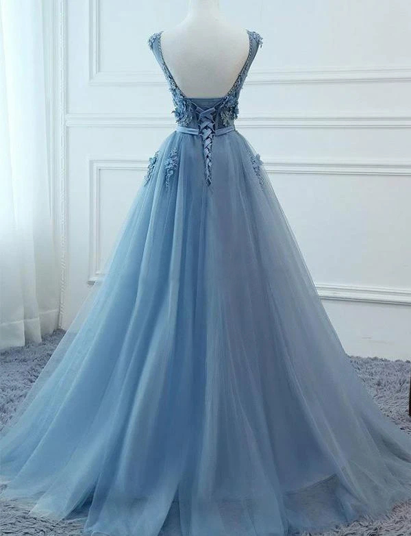 Delicate V-Neck Blue Prom Dresses A-Line Lace Appliques Pearls Beading Evening Dresses Low Back Bachelorette Party Dress