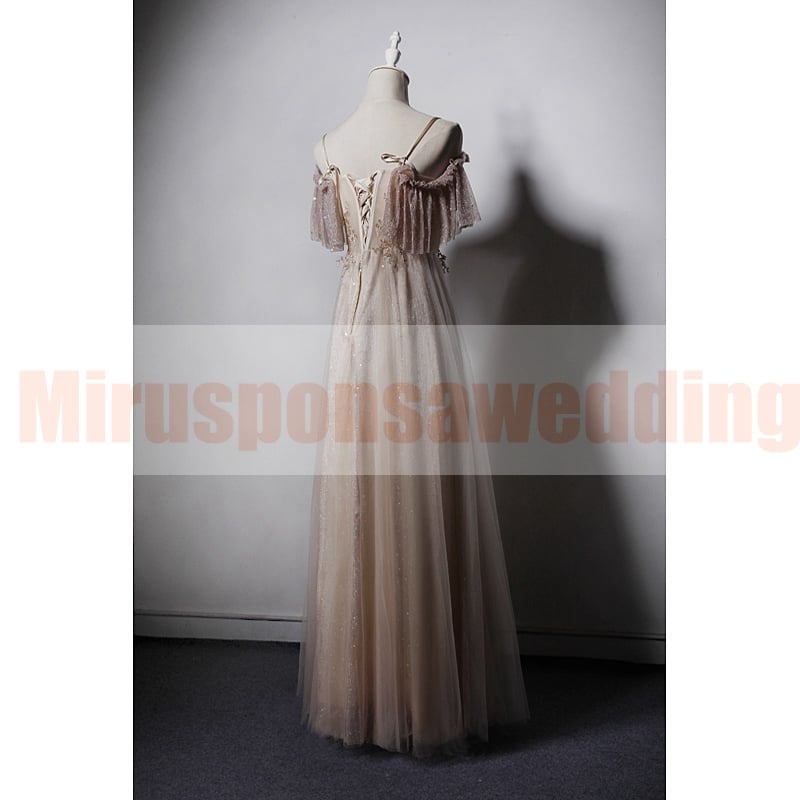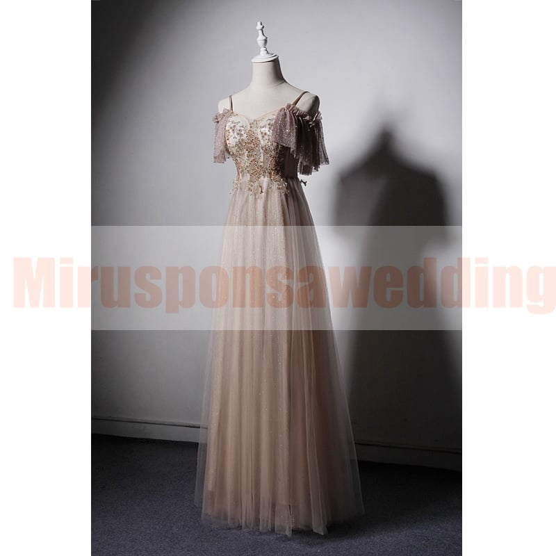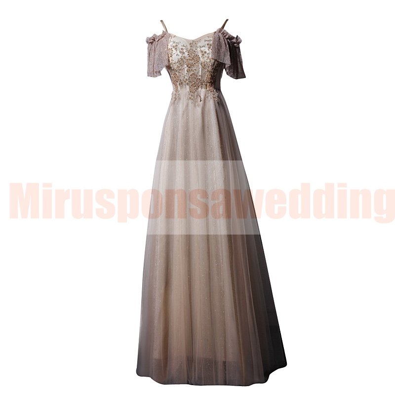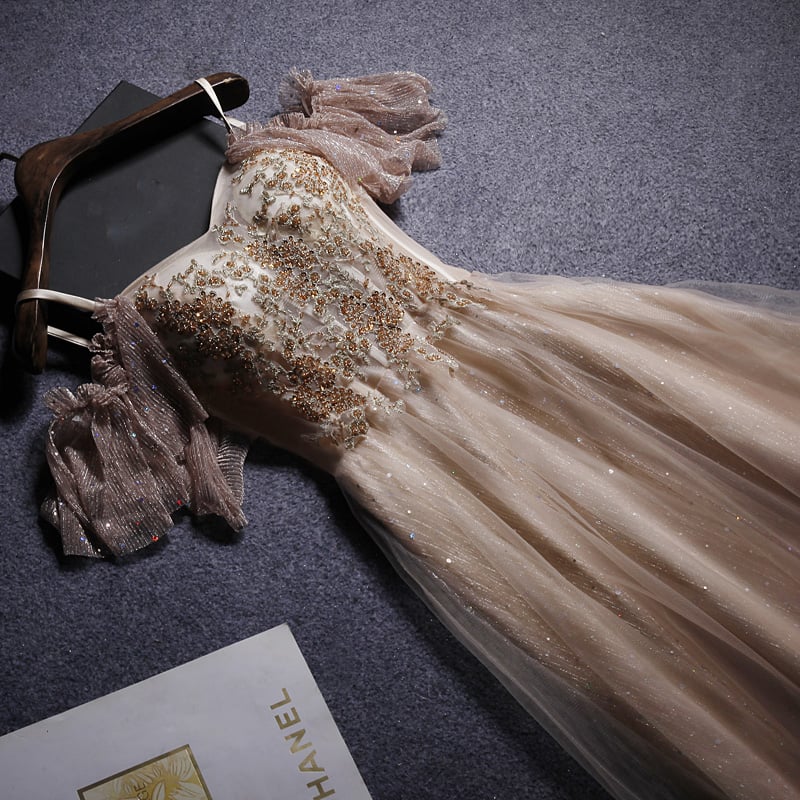 Classic Spaghetti Straps Tulle A Line Prom Dresses Exquisite Major Beaded Champagne Evening Gowns Floor Length Beautiful Evening Dresses