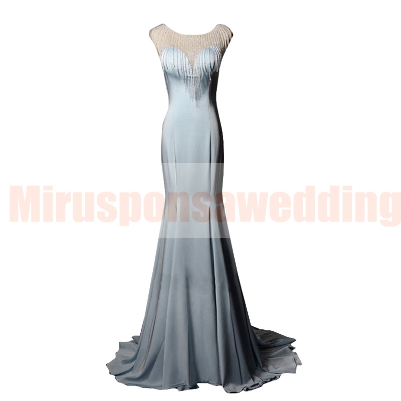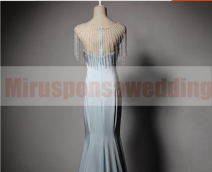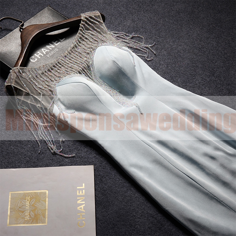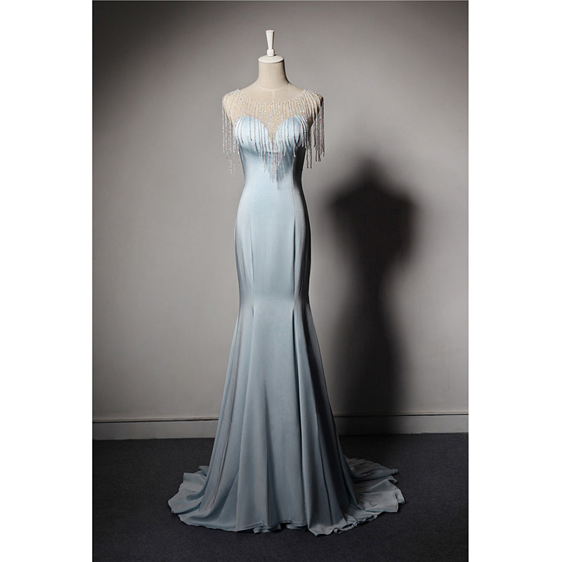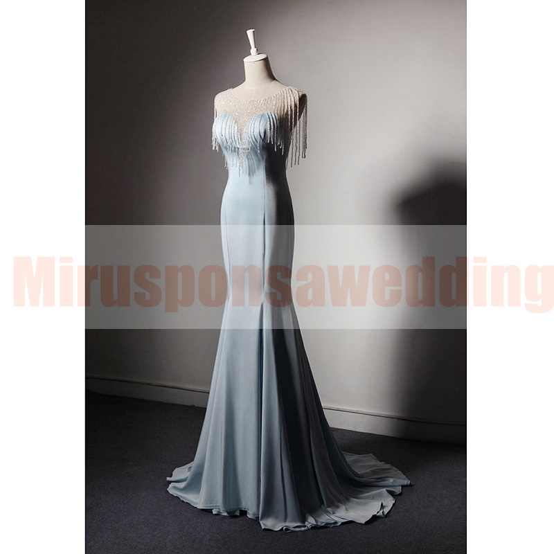 Charming Sheer Neck Mermaid Evening Gowns Elegant Beading Tassels Satin Formal Party Dresses Light Blue Long Evening Dresses with Zipper Up Back