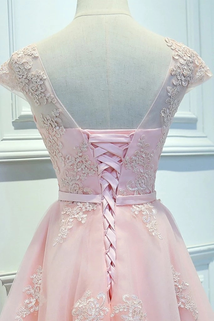 Chic Scoop Cap Sleeve Beautiful Prom Dresses A-Line Lace Applique Short Pink Homecoming Dresses with Sash Bodice Party Dresses for Juniors