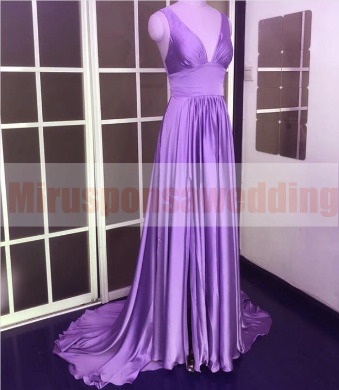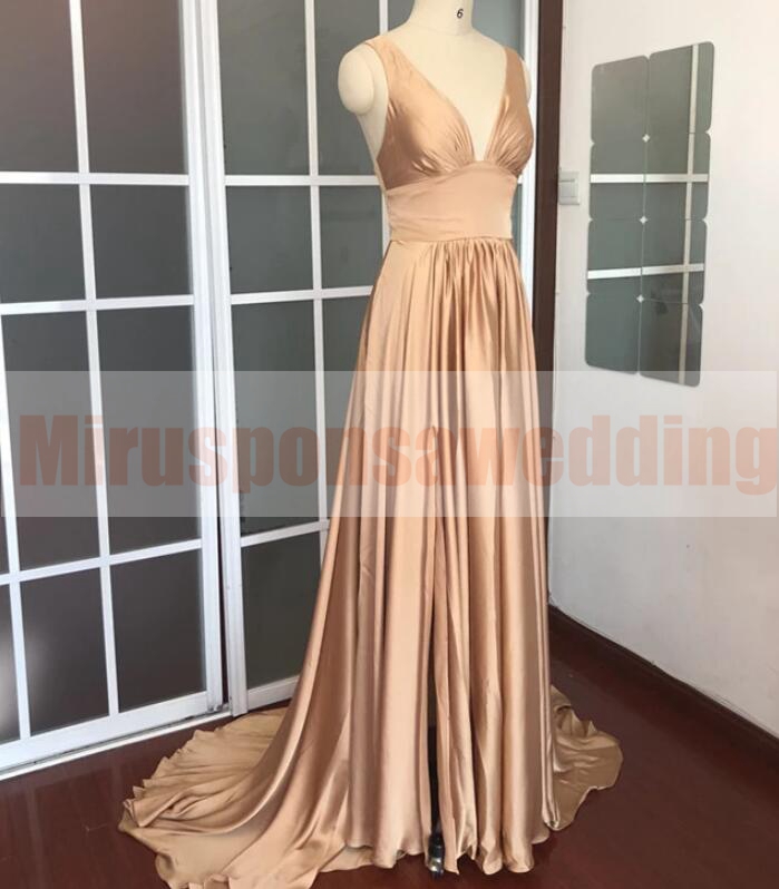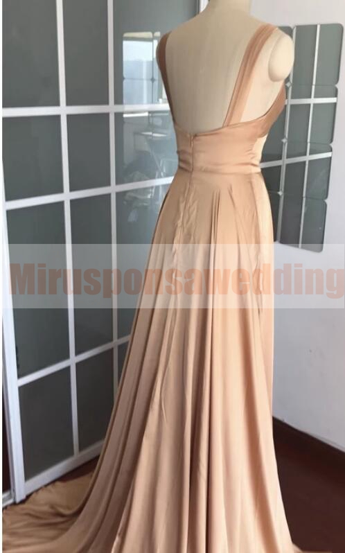 Sexy V-Neck Champagne Prom Dresses Sleeveless Long Evening Gowns with Sweep Train Ruched Satin Evening Dresses with Zipper
