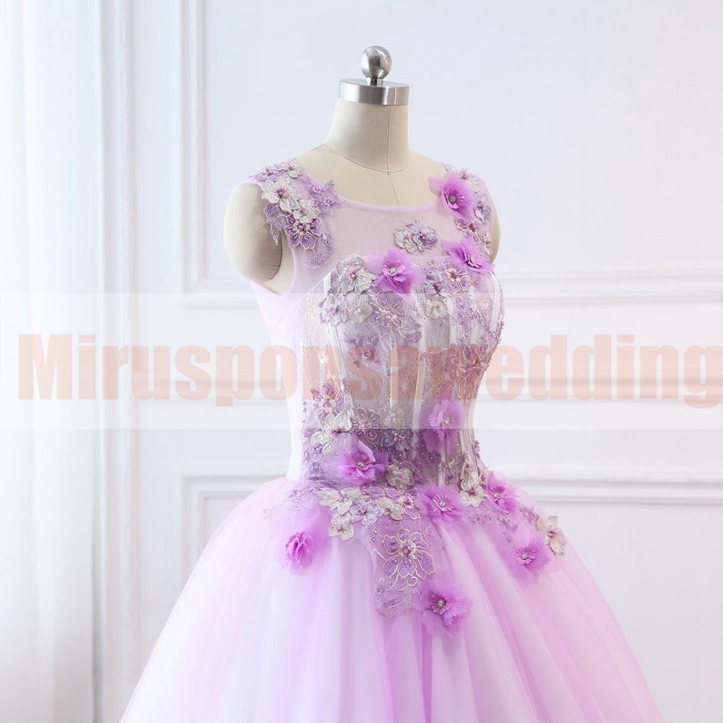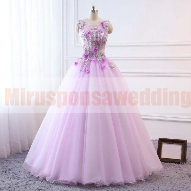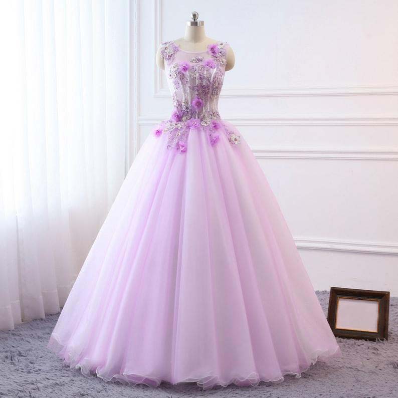 2020 Sheer Neck Ball Gown Evening Dresses 3D Floral Appliques Lavender Prom Dress Sleeveless Ruched Tulle Princess Evening Gowns with Lace Up