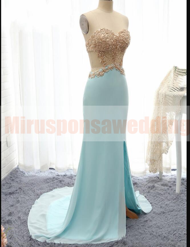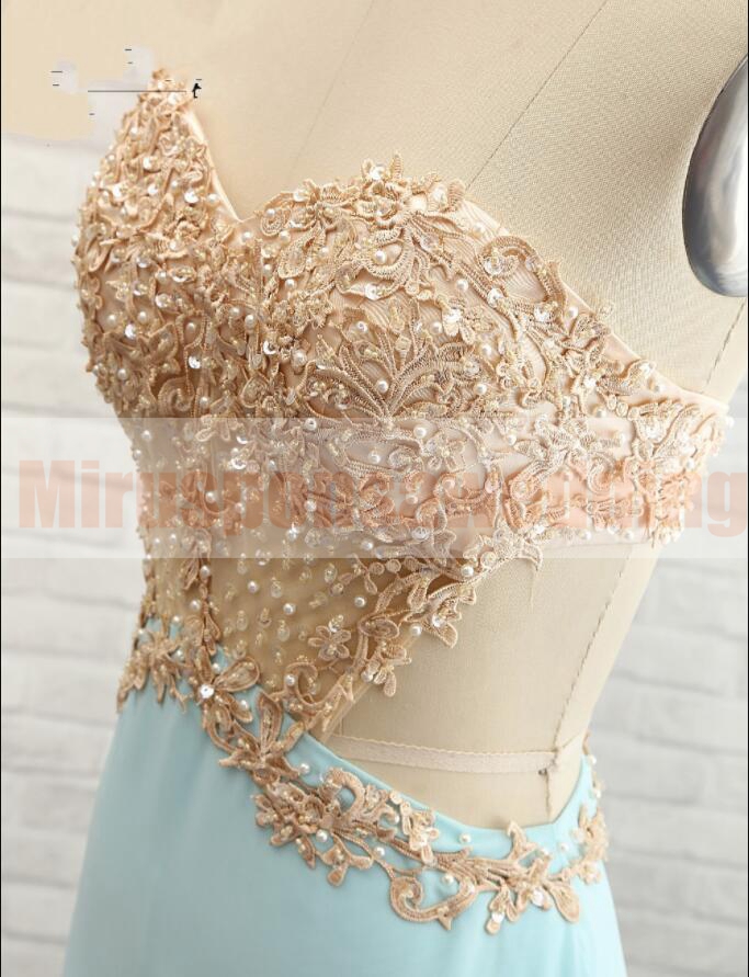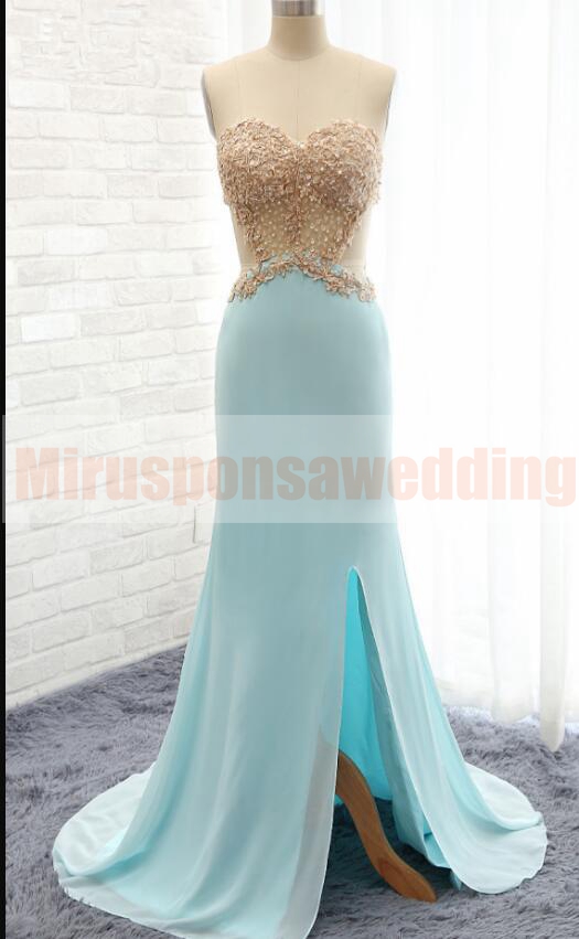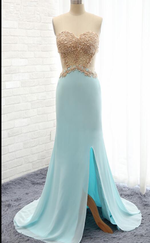 Strapless Light Sky Blue Chiffon Prom Dress Lace Appliques A Line Evening Dresses Pearls Beading Boho Evening Gowns with Side Split