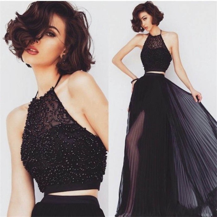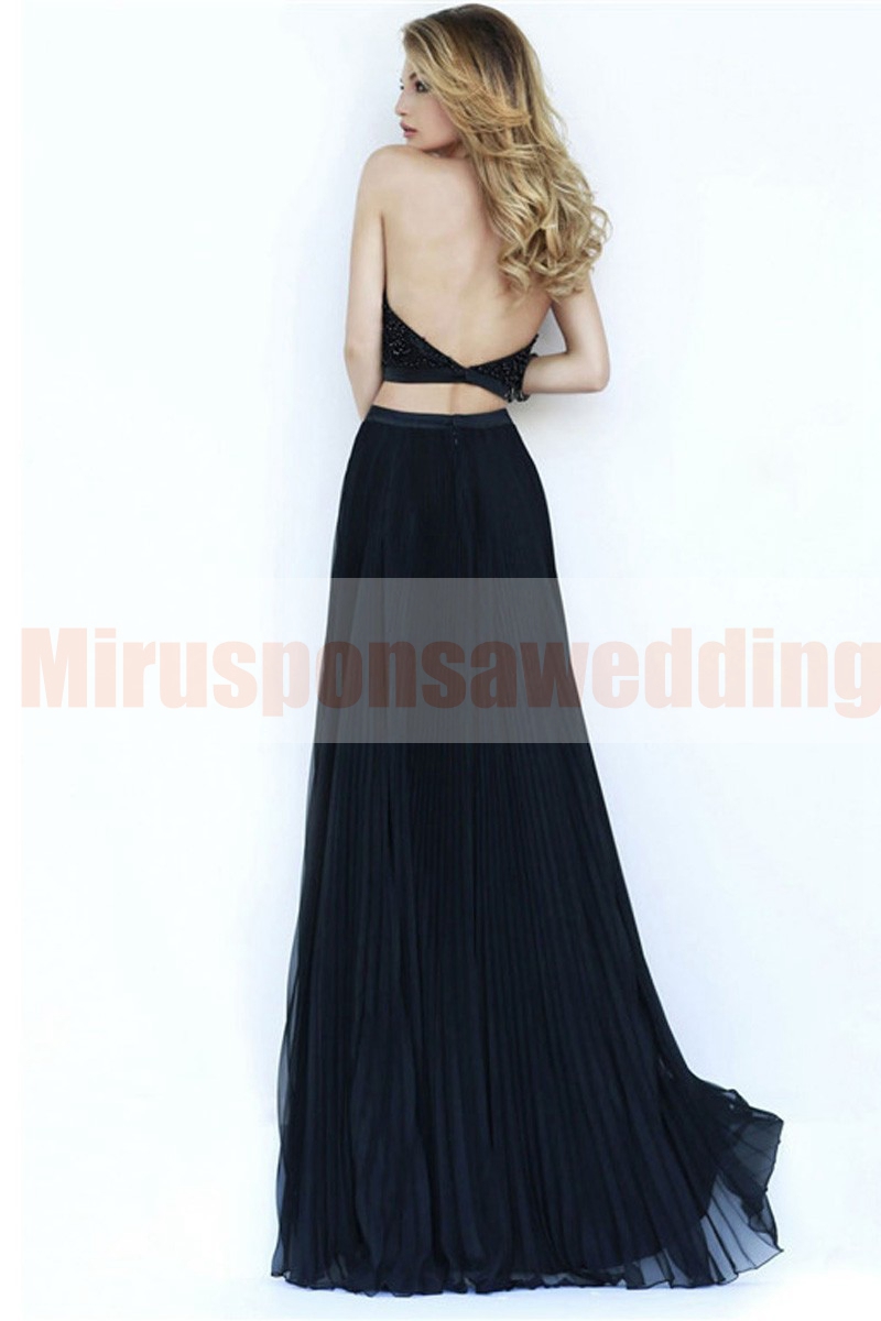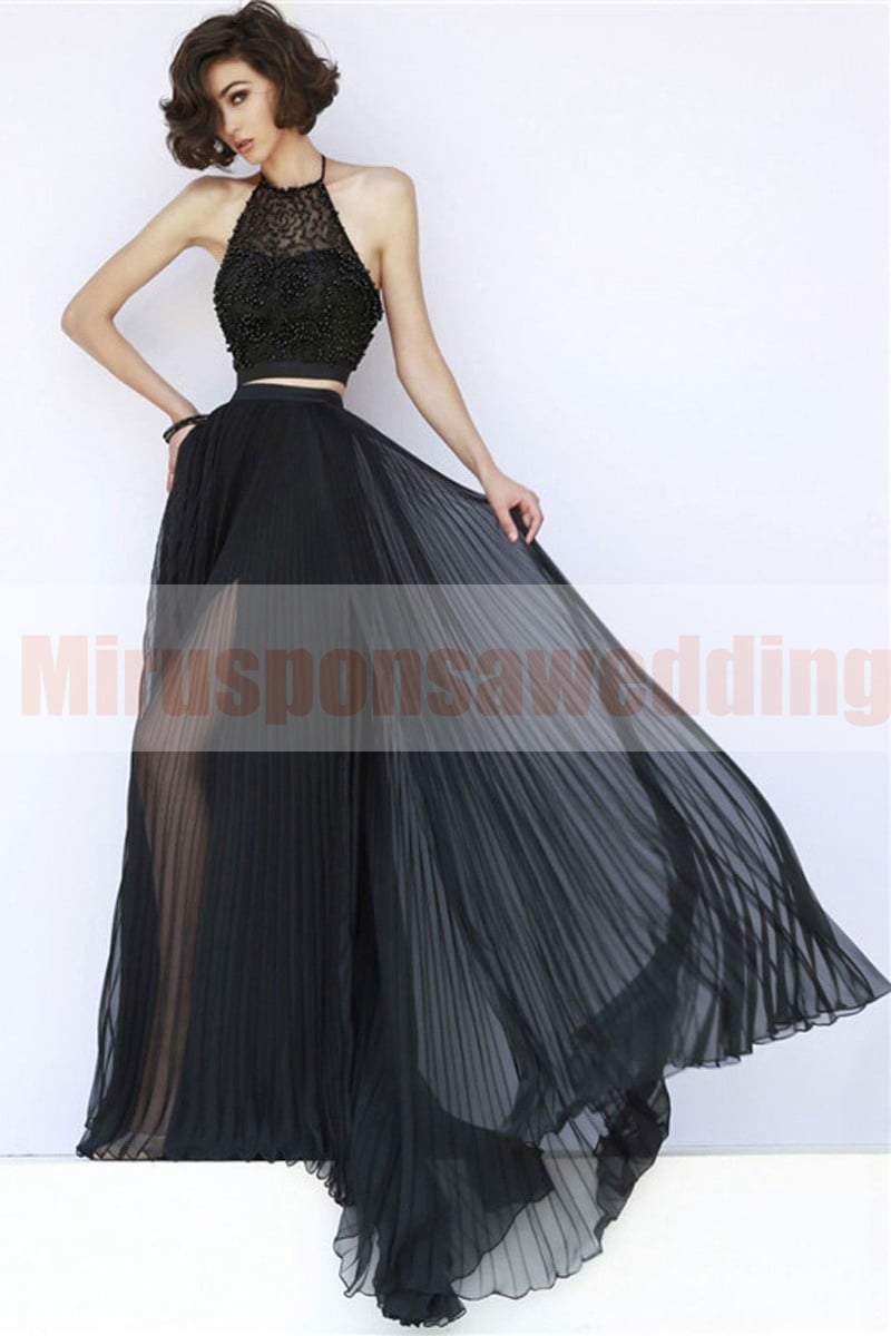 Sexy Halter Neck Chiffon Prom Dresses Major Beaded A Line Black Evening Gowns Illusion Bodice Backless 2 Pieces Evening Dresses with Sweep Train
