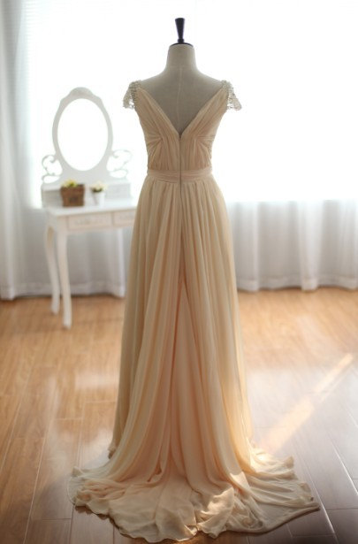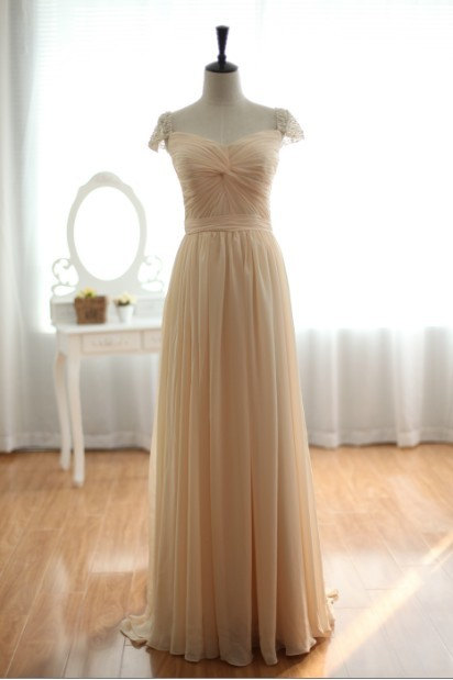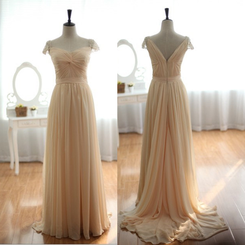 Champagne Chiffon Pearls Beaded Cap sleeve Bridal Wedding Dress Gown Bridesmaid Dress, Wedding Party Dress