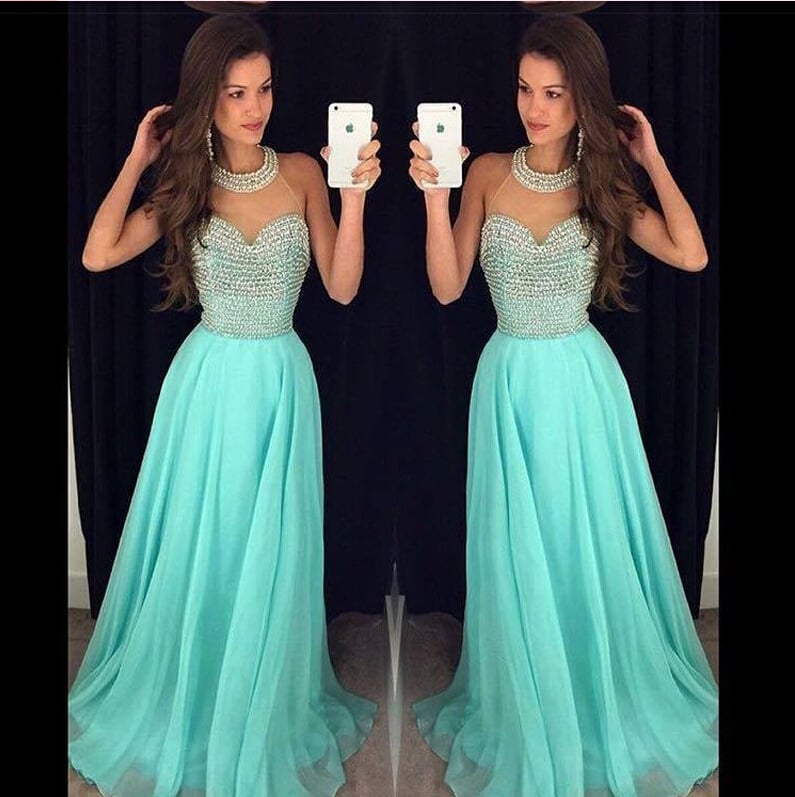 Luxury Evening Dresses, High Neck Heavy Beads Blue Chiffon Long Prom Dress, A Line Custom Made Evening Dresses Prom For Senior Junior Teens