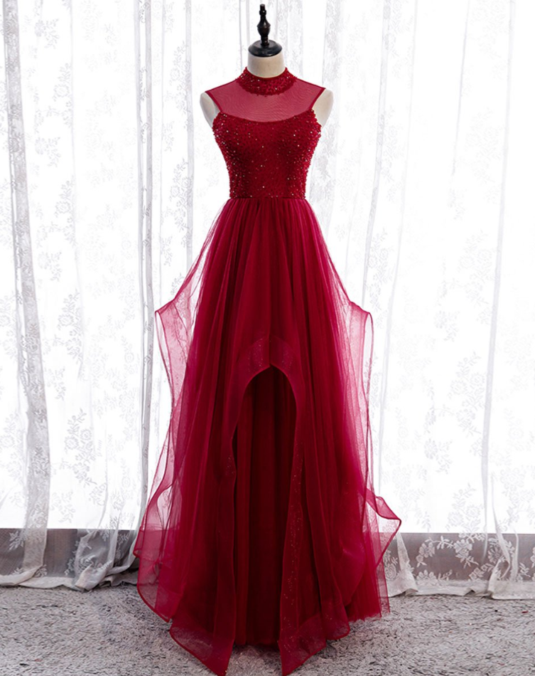 Long Prom Dresses, Burgundy High Neck Tulle Sequin Beads Long Evening Dress, Party Dresses