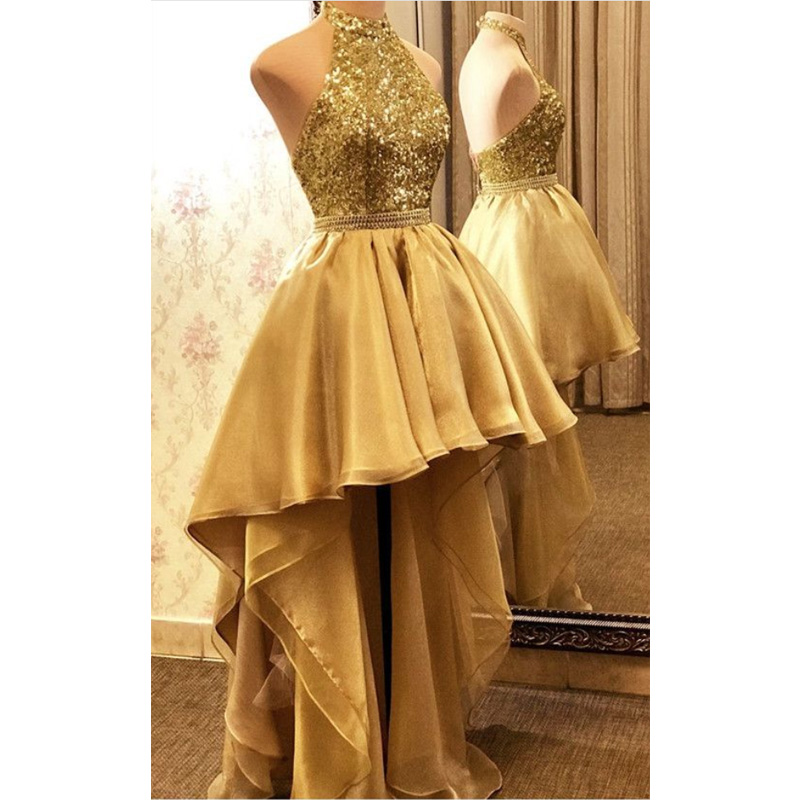 gold prom dresses, high front and low back evening dresses, sequins prom dresses, organza evening dresses, gold formal dresses, evening dresses