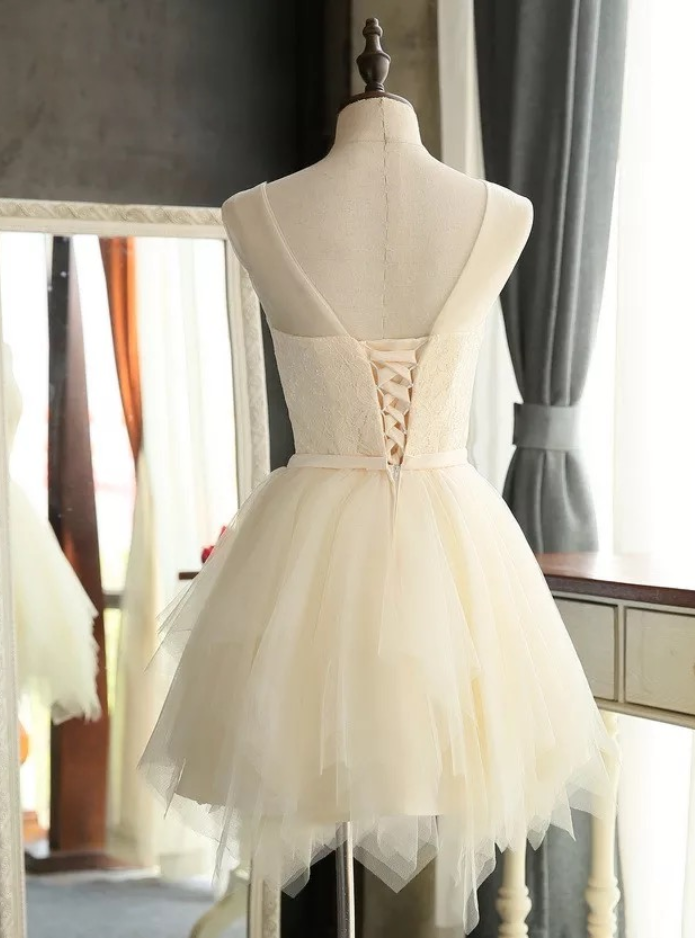 Ivory tulle short lace round neck prom dress, bowknot bridesmaid dress, Short Homecoming Dresses