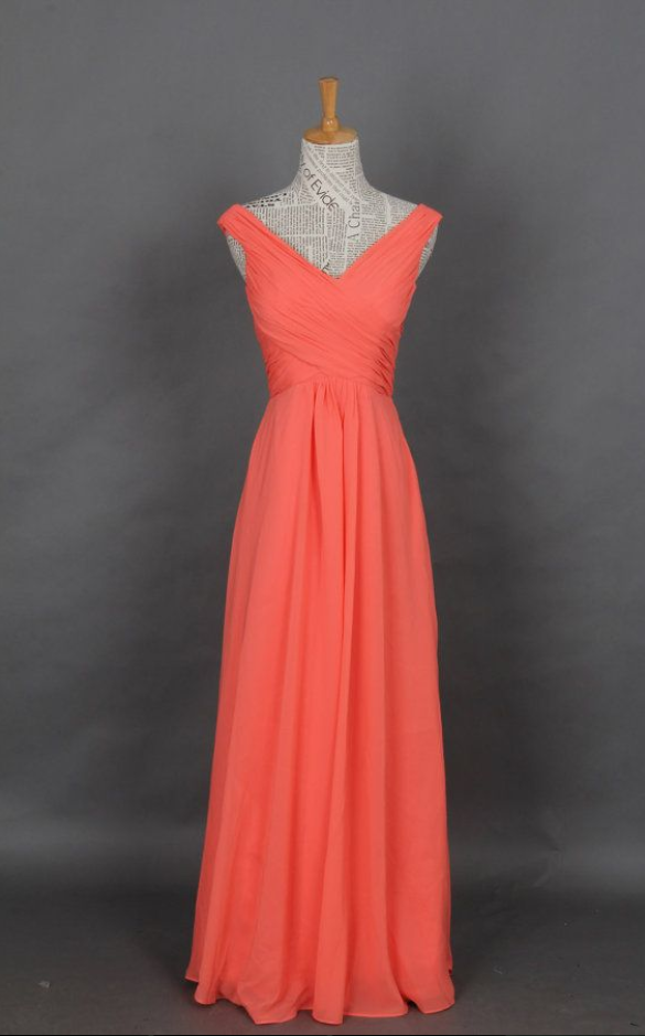 Hot Sale Chiffon Floor Length Strapless V Neck Coral Prom Dress , Party Dresses, Evening Dresses, Graduation Dresses, Modest Bridesmaid Dresses