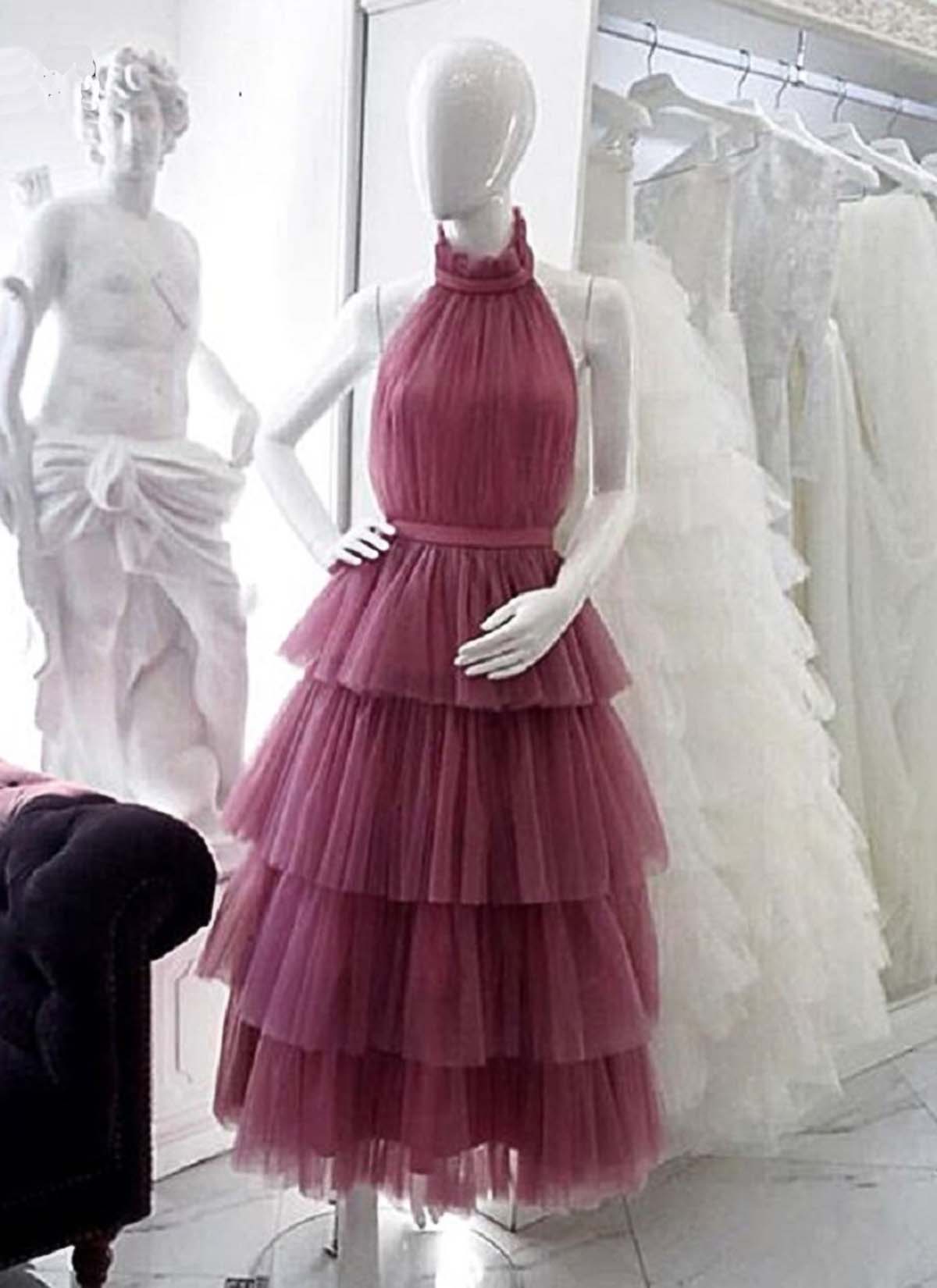Dark Red Tulle Backless O Neck Layered Prom Dress, Party Dress